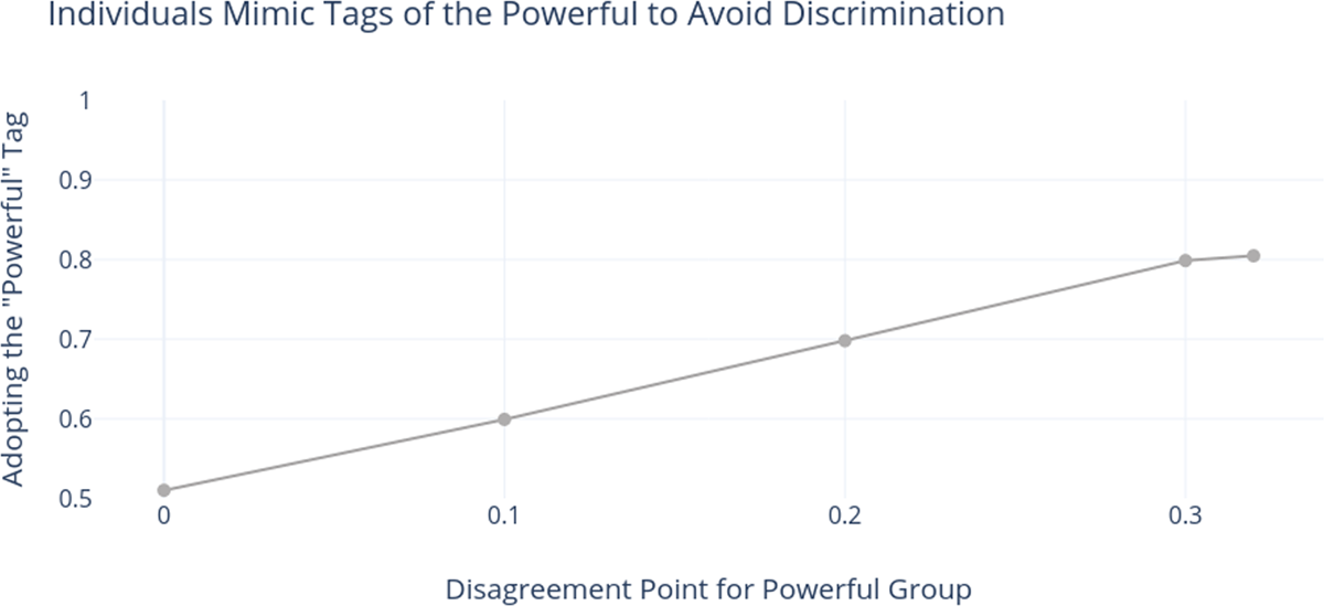 Popa et al. (2021) consider a further pair of models. In the first model, only one powerful group has the ability to flexibly change tags. In the second, only one less powerful group has this ability. When the disempowered group is unable to change, they find that discrimination regularly emerges. The powerful group often adopts a distinctive tag for themselves, and uses the inflexible tag of the other group to organise bargaining inequity. Furthermore, this is more likely when the powerful group is particularly powerful (i.e., has a very high disagreement point). When the disempowered group can change tags, on the other hand, they “camouflage” by mimicking the tag of the powerful group, and preventing discrimination.