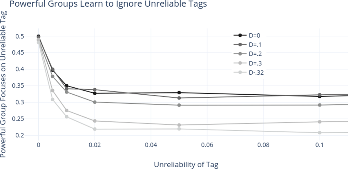 We run simulations of this model, varying both the disagreement point of the powerful group, and also , or how unreliable the unreliable tag is.23 We ask, across these variations, how often do members of the powerful group end up attending to these different tags? Do they learn to choose the reliable one, allowing them to successfully identify out-group members? Does doing so facilitate discrimination?