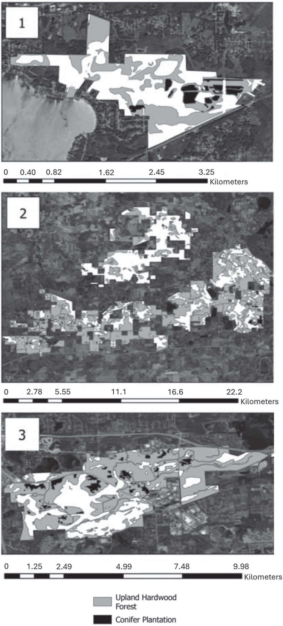 We assessed the extent of pine plantations and their suitability for oak regeneration in three large, forested recreation areas in the southern Lower Peninsula of Michigan. Waterloo Recreation Area (8000 ha) located between Jackson and Ann Arbor, Michigan and Island Lake State Recreation Area (1600 ha) located just southeast of Brighton, Michigan are large tracts managed by the Parks and Recreation Division of the Michigan Department of Natural Resources (MDNR) and are managed for both recreation and preservation of natural and cultural resources (MDNR 2012a and 2012b). Lake Lansing Park North just east of Lansing, Michigan is a 214-ha forested park managed as a natural recreation area by the Ingham County Parks Department. Uplands of all three parks are dominated by glaciofluvial landforms including outwash and ice-contact terrain, and all have excellent representation of oak-dominated Dry Southern Forest and Dry-Mesic Southern Forest natural communities as defined in Albert et al. (2014).
