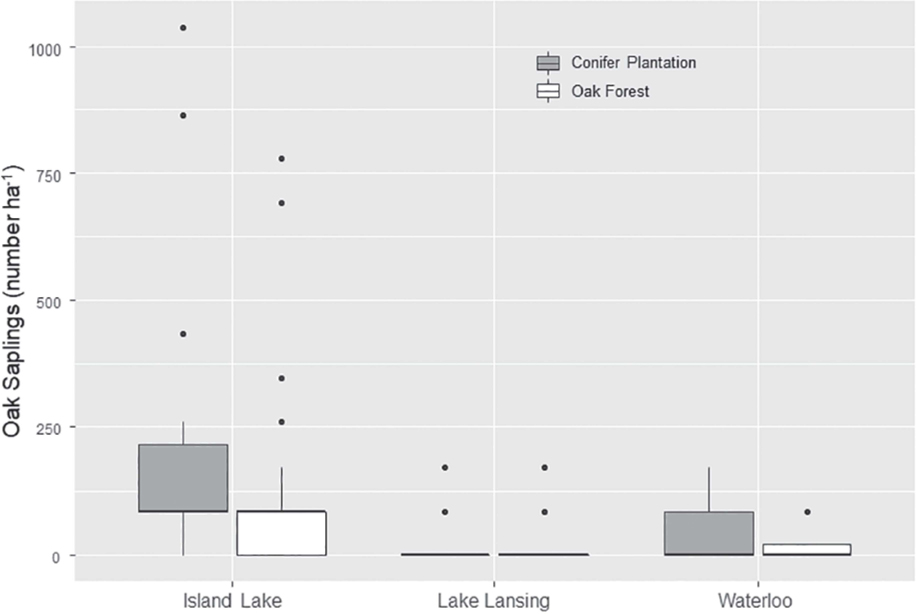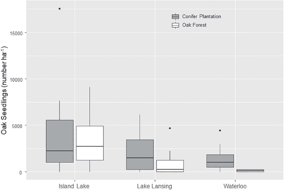 Oak seedling density in pine plantations and native oak forests across all the parks is shown in Figure 2. Overall, there was no statistically significant difference in oak seedling density between pine plantations and native oak forests (p = 0.365), although patterns in the data varied across the parks. Oak seedling density tended to be greater at Island Lake State Recreation Area and lower overall at Lake Lansing Park North and Waterloo State Recreation Area.