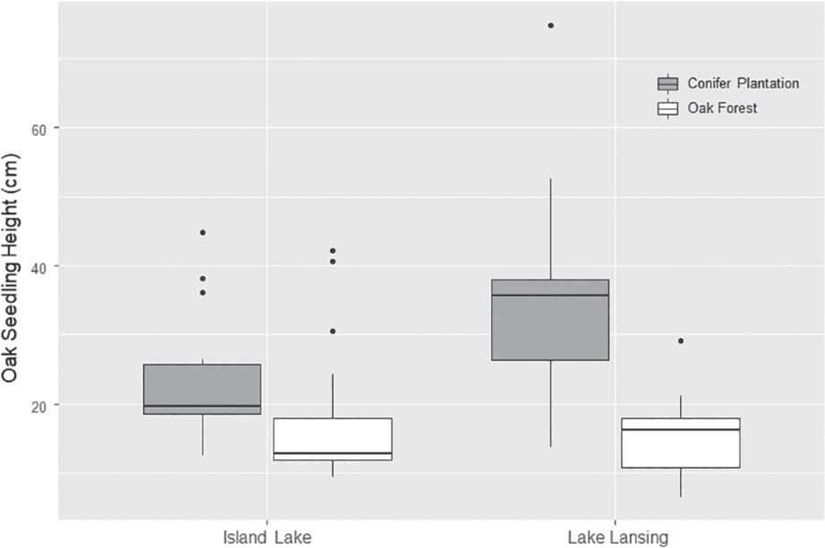 In contrast to oak seedling density, there was a statistically-significant effect of cover type on oak seedling height (p = 0.017), whereby oak seedlings were much taller under pine plantations than they were under native oak forest canopy (Figure 3). Note that because all but two oak forest plots at Waterloo had zero oak seedlings, we confined our analysis of seedling heights to Island Lake and Lake Lansing parks. This pattern was pronounced and consistent across the two parks, with oak seedlings growing under an oak canopy rarely exceeding 20 cm in height (Figure 3). Finally, there was no statistically significant difference in oak sapling density between pine plantations and native oak forests (p = 0.340) (Figure 4). Oak saplings were almost entirely absent from either cover type at Lake Lansing Park North, whereas they were more common at the other two parks (Figure 3).