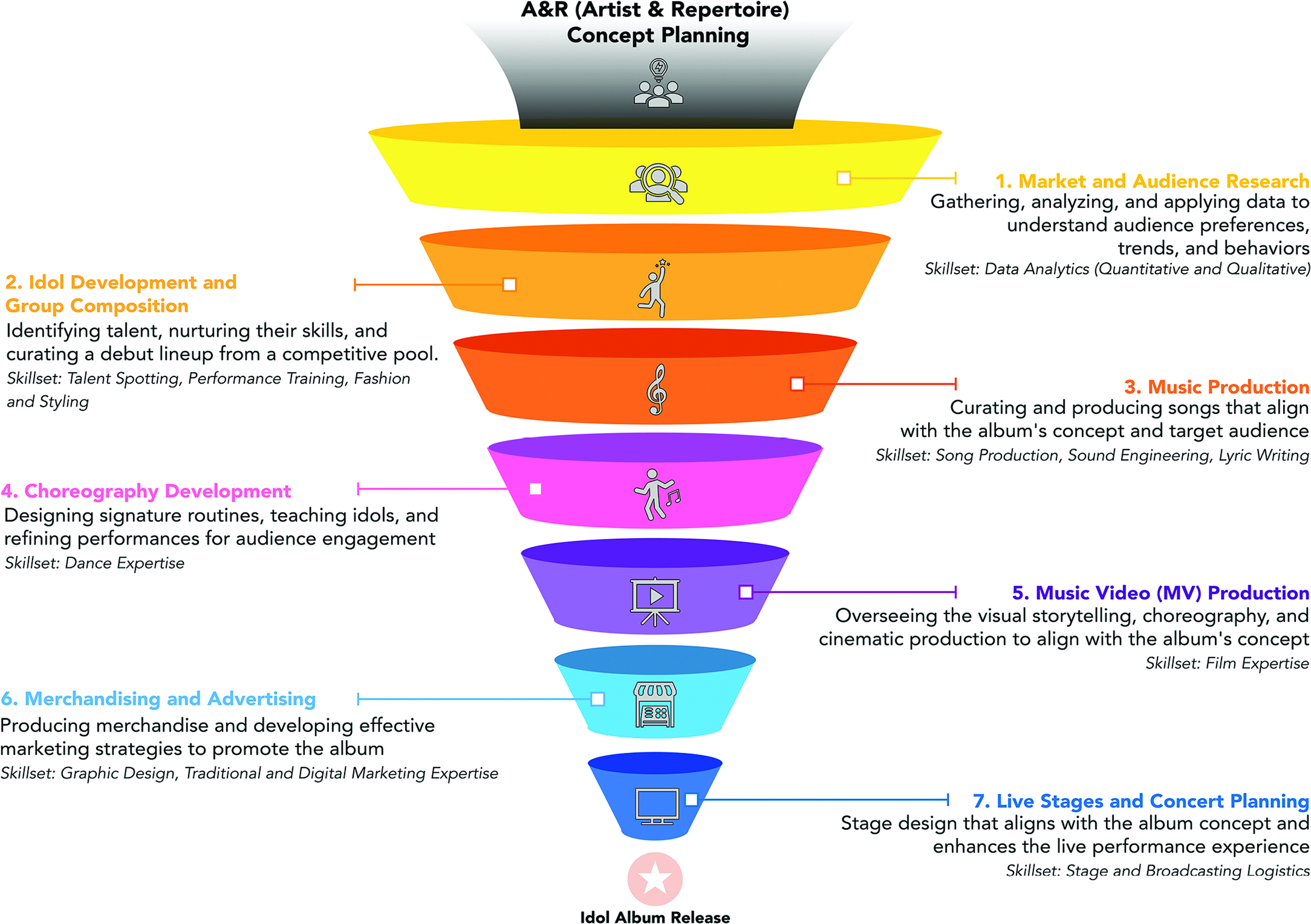 Across the three hagwons where we conducted research, a central objective is to equip students with the core competencies needed to navigate the highly selective hiring processes within the K-pop industry. Each hagwon takes pride in its ability to place students in highly sought-after positions within the K-pop industry, assuring that those who complete the full course will gain a comprehensive understanding of the workflow, division of labor, and professional demands in idol production. These demands encompass all aspects of K-pop album production, from concept planning and idol training to marketing and promotion. The production process is summarized in figure 1.