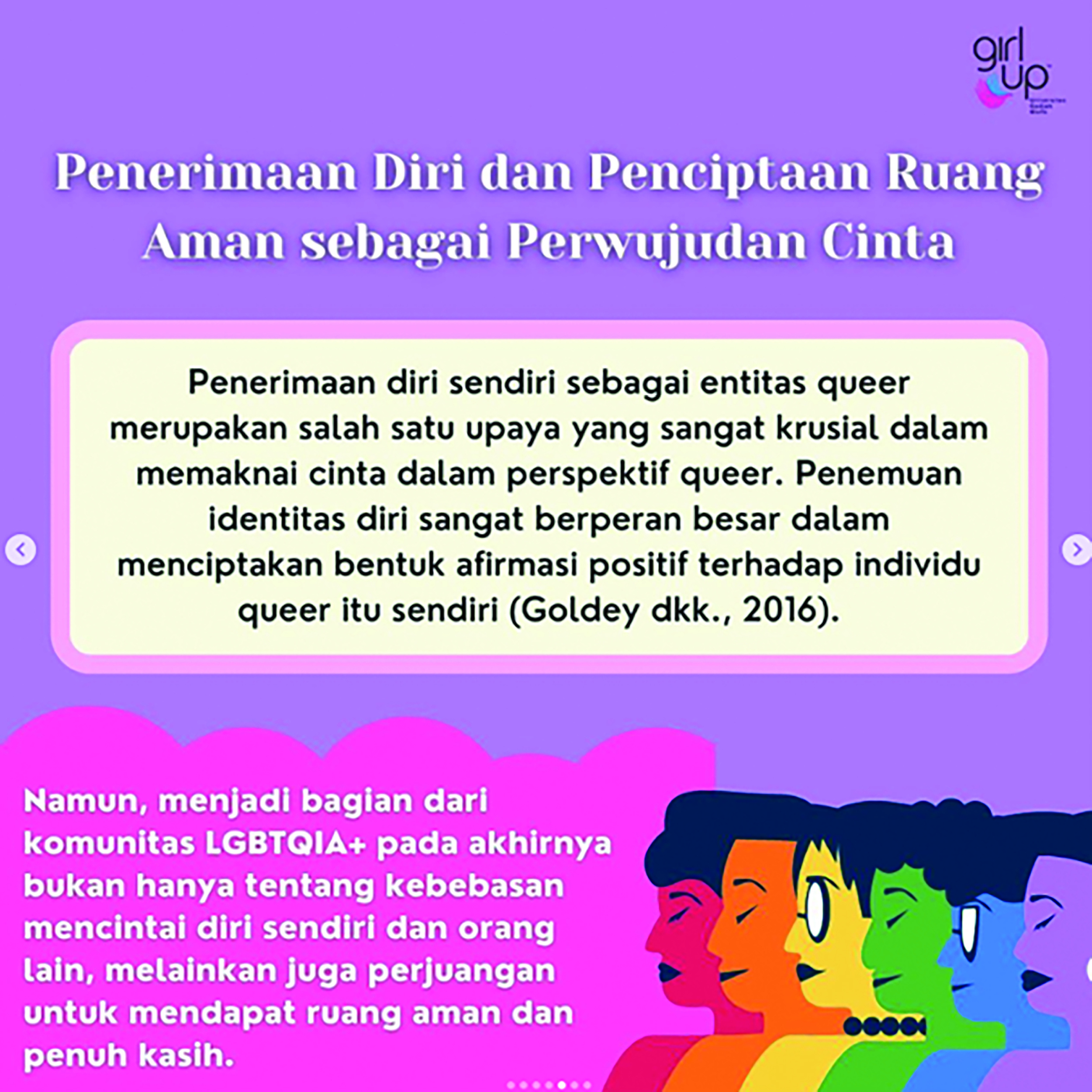 - This screenshot is part of a larger slide on Girl Up UGM’s Instagram page titled “Redefining the Meaning of Love Through a Queer Perspective,” posted on February 26, 2022. On this specific post, it addresses the notion of “self-acceptance and the creation of safe spaces as a form of love” within queer communities. This post is one of many educational posts circulated by this student organization pertaining to issues of gender and sexuality. Despite its significance, posts like this tend to be flagged by anti-LGBTQ pundits, leading to occasional deactivations of the account. ⮭