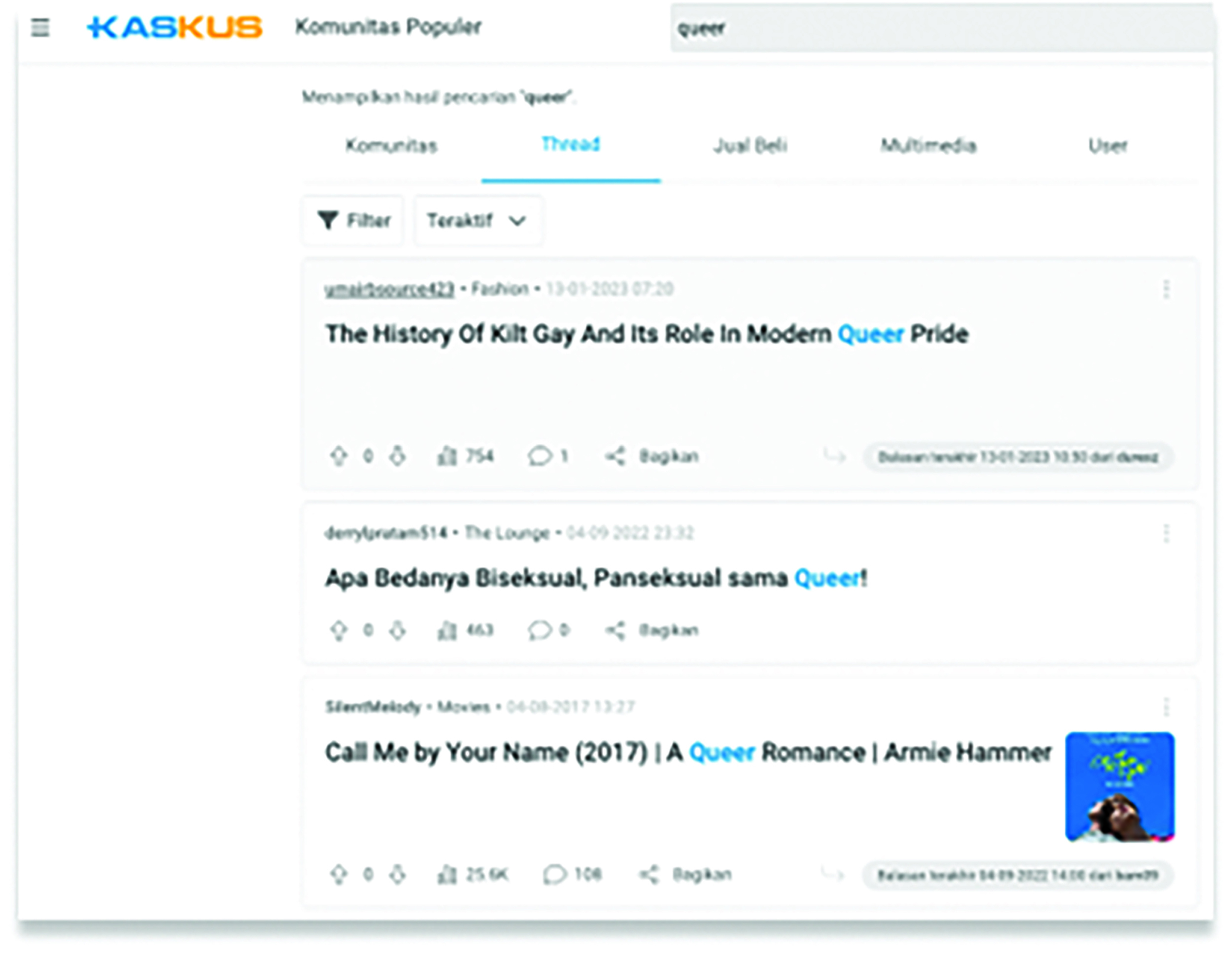 - A screenshot of Kaskus, the largest internet forum in Indonesia. Having been around since 1999, Kaskus still maintains its simple forum and community-based format just like Reddit and Quora. In this screenshot of Kaskus search, I explored posts using the keywords “LGBT” and “Queer.” For “LGBT,” most of the results center negative and humorous postings, such as “how to do anti-LGBT black magic.” In contrasts, posts under “Queer” are often created by individuals seeking knowledge, exploring LGBTQ history, or discussing queer pop culture. In this screenshot, the first post delves into the history of Pride movement and the use of European kilts to challenge gender norms. The second post inquires, “what is the difference between bisexual, pansexual, and queer,” while the last provides a review of the queer-centered film Call Me by Your Name (2017). ⮭