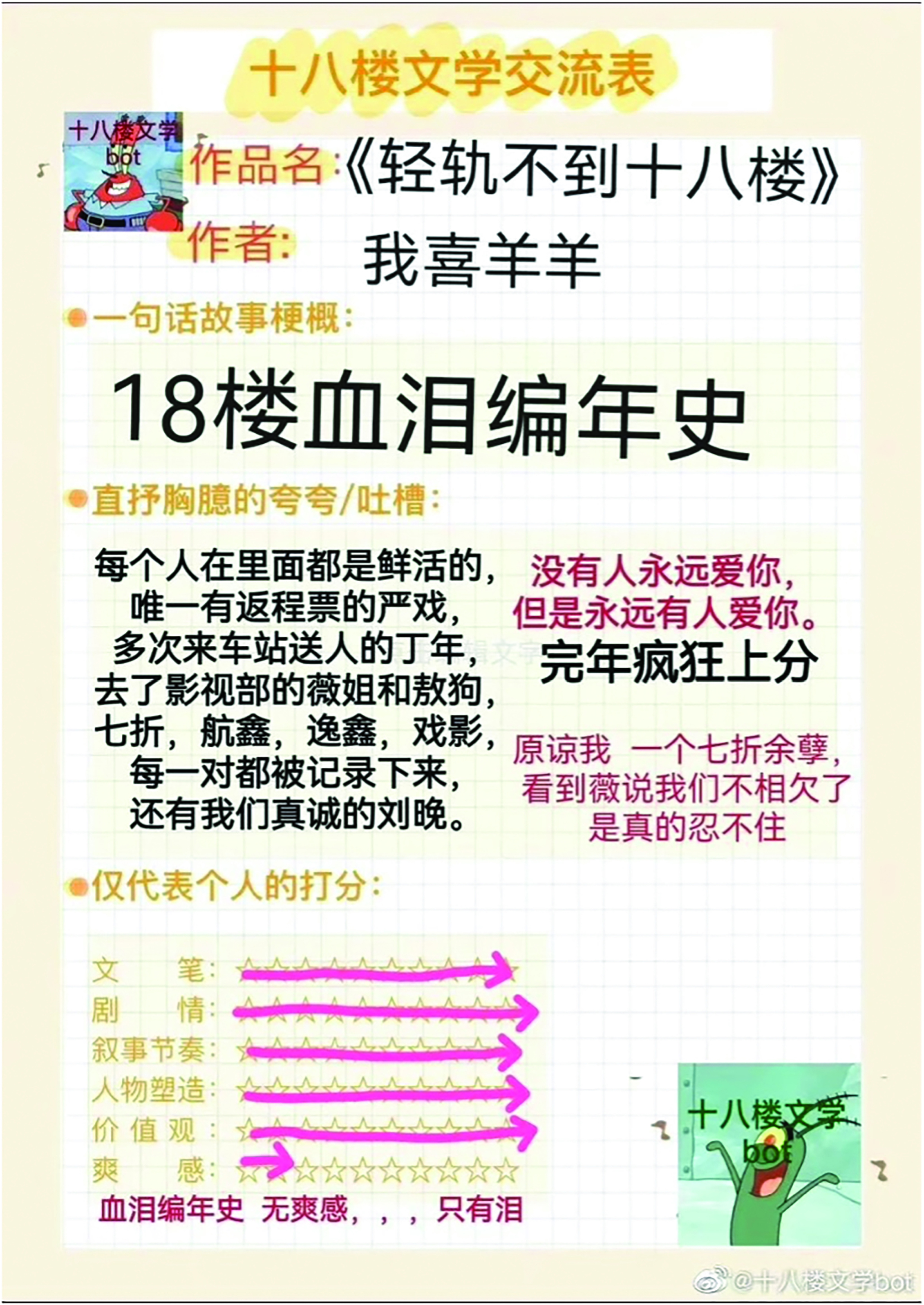- ShibalouwenxueBot, “A Literary Feast like Rare Delicacies? Only Veteran Fans Know the Truth but Stay Quiet! Eighteenth Floor Fanfic Panel: Light Rail Does Not Reach the Eighteenth Floor,” video, Bilibili, August 27, 2022, 05:50. ⮭