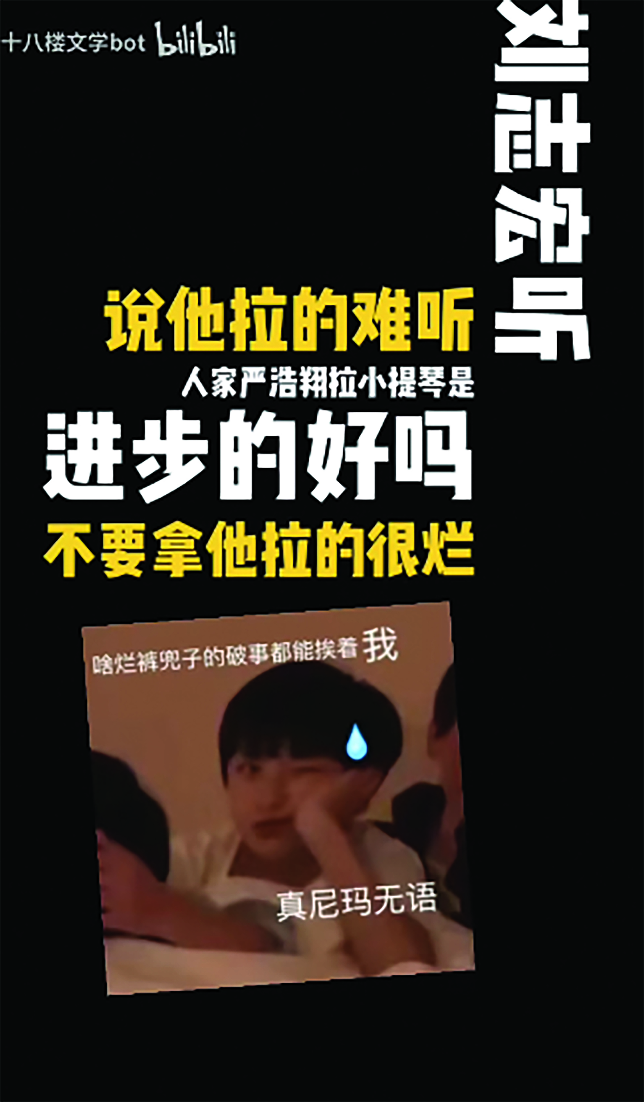 In a reaction video on reading Light Rail, the reactors contend that fans have overrated this work, which wrongly reflects the history that both the trainees and fans have experienced. Claiming themselves to be “veteran fans” who hold temporal proximity and experiential authority, the reactors fiercely criticize Light Rail for selective rewriting and omission, constituting a “brainwashing package” (xinao bao), which greatly diverges from their accounts yet receives wide support among fan groups. In the reactors’ reading of Yan’s return, they believe that describing Yan’s poor violin skills is propagating disinformation about the real person: