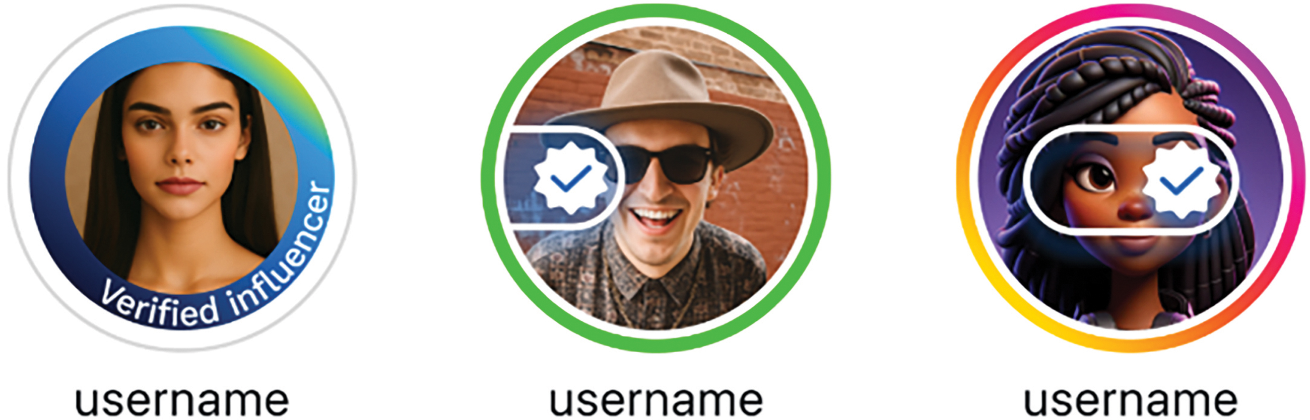 Beyond profile screens, audiences also encounter competence cues in high-velocity surfaces such as story rings, where rapid, pre-attentive judgments are made. Figure 3 presents three brand-agnostic avatar-ring variants that preserve platform visual grammars while adding a compact competence/ethics cue.