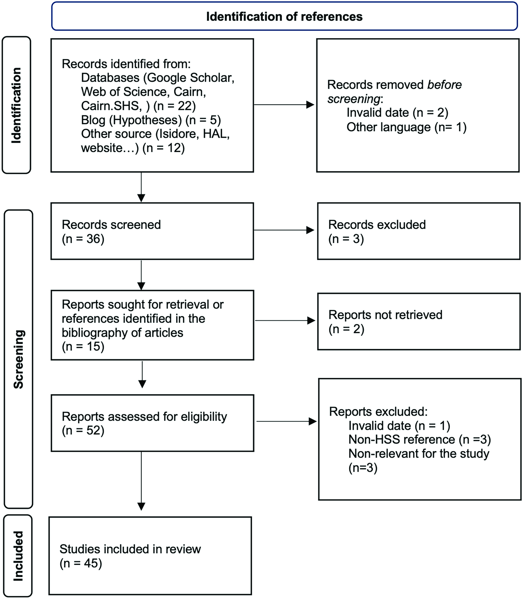 We applied the PRISMA methodology (Moher et al. 2010) to guide the iterative selection of the corpus (see figure 1). During this process, three references were excluded for not meeting inclusion criteria. The selected references respected HSS disciplinary representativeness. The final corpus consisted of 45 references (see Appendix, Table 1 and see dataset on Zenodo: 10.5281/zenodo.18484510).