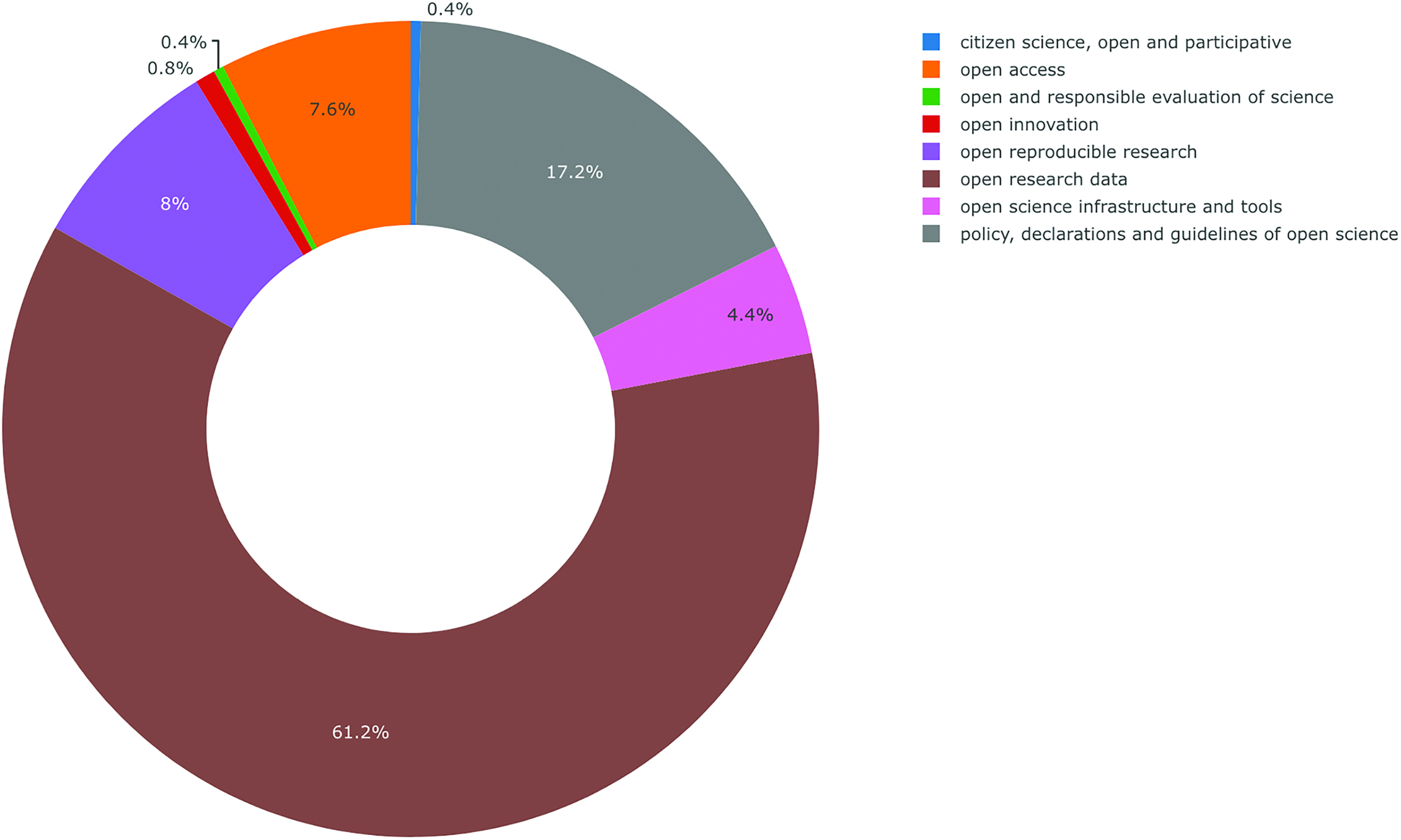 Figure 3 illustrates the distribution of the 250 quotations, as indexed according to the 10 OS facets of da Silveira et al.’s (2023) taxonomy. The figure shows that only eight of 10 facets are represented. The most important is Open Research Data, representing 61.2% of quotations, highlighting the intensity of researchers’ critiques. The second most represented facet is policy, declarations and guidelines, at 17.2%. In contrast, open reproducible research and Open Access are less frequently addressed, representing 8% and 7.6% of quotations, respectively.