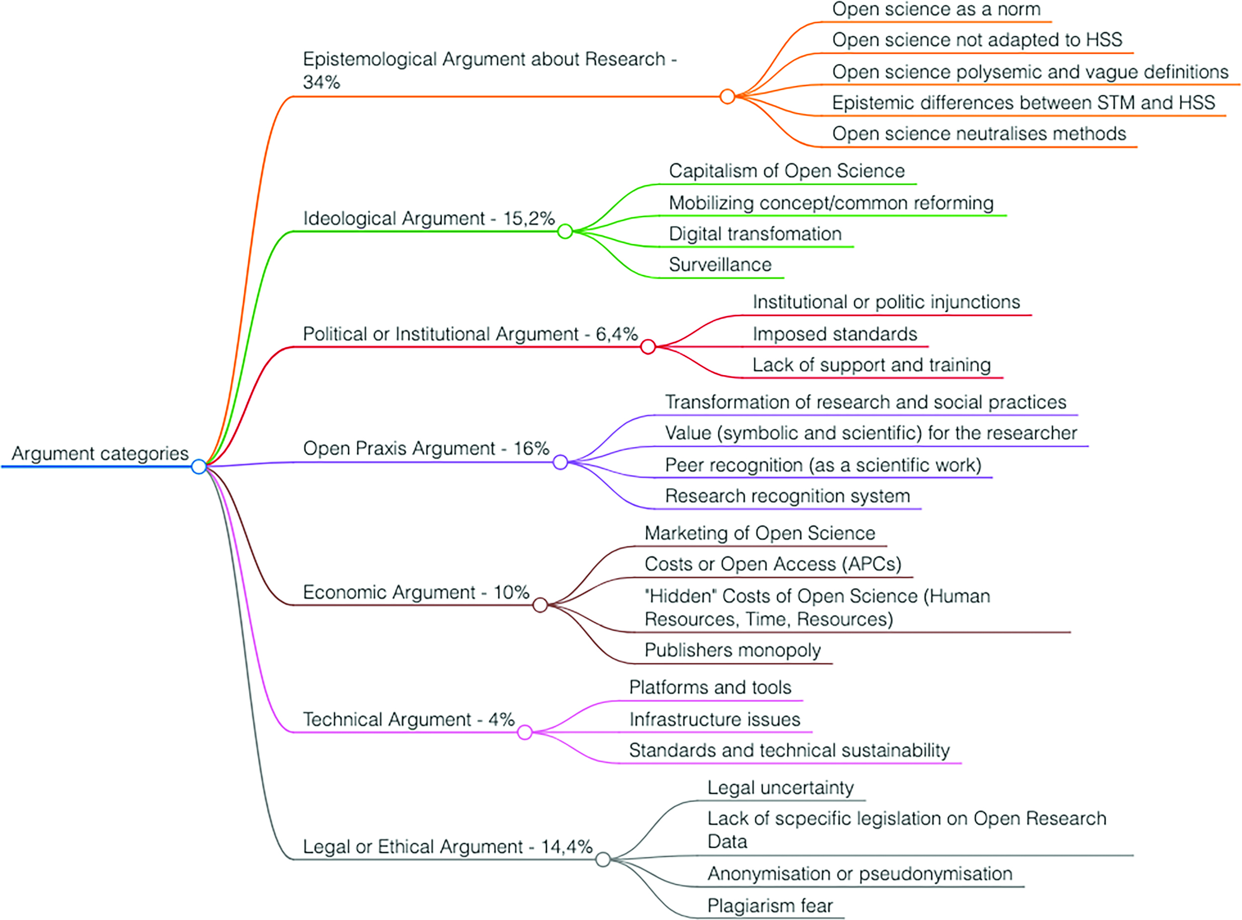 The Political or Institutional Argument category (6.4%) encompasses criticism of the political and institutional dimensions of French OS policy. This category has three sub-themes: institutional or political injunctions, imposed standards, and lack of support and training. Typically, as mentioned by a researcher from INED, top-down policy implementation has been perceived as coercive (see Appendix, table 6, quotation 193) (institutional or political injunctions). The two other sub-themes are the rejection of uniform political or institutional standards seen as incompatible with disciplinary diversity (imposed standards) and highlighting the insufficient institutional support and concerns about lack of training for implementing OS in everyday research activities (lack of support and training).