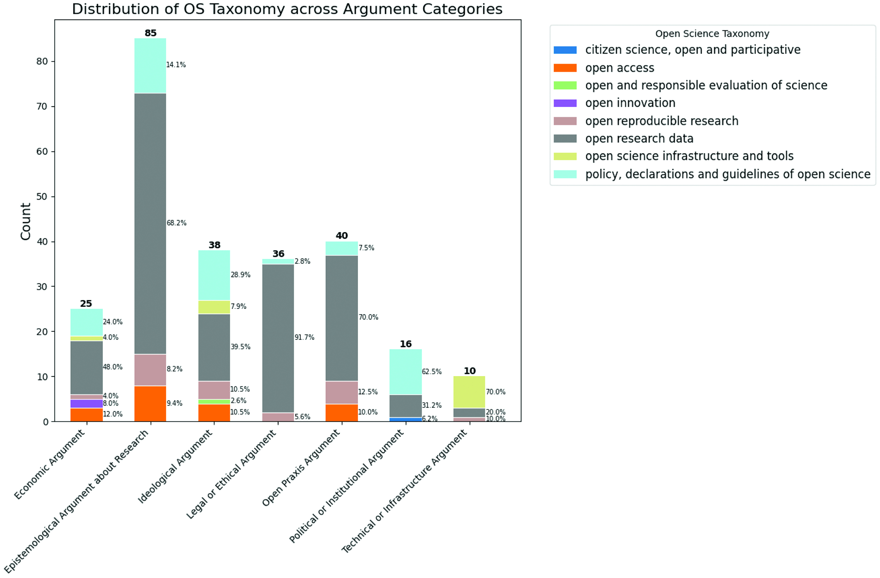 From figure 5, we can observe that the most wide-reaching and frequently mentioned OS facet across all arguments is Open Research Data. It is clearly the dominating facet when comparing the seven argument categories: it represents 48.0% of Economic Arguments; 68.2% of Epistemological Arguments; 39.5% of Ideological Arguments; 91.7% of Legal and Ethical Arguments; and 70.0% of Open Praxis Arguments. The Legal and Ethical Argument category contains the highest concentration of references to Open Research Data (91.7%). These arguments primarily address legal uncertainties and concerns related to data anonymization and pseudonymization, issues that specifically pertain to research data. Of 36 arguments in this category, 33 are directly related to Open Research Data. By contrast, we also observe that Open Innovation as a facet appears only in the Economic Argument, with 8.0% in the category. The Citizen Science facet appears only in the Political and Institutional Argument, with only 6.2%. Conversely, the Open Access facet is represented at a surprisingly low rate and in only four categories of arguments (Economic Arguments, Epistemological Arguments About Research, Ideological Arguments, and Open Praxis Arguments).