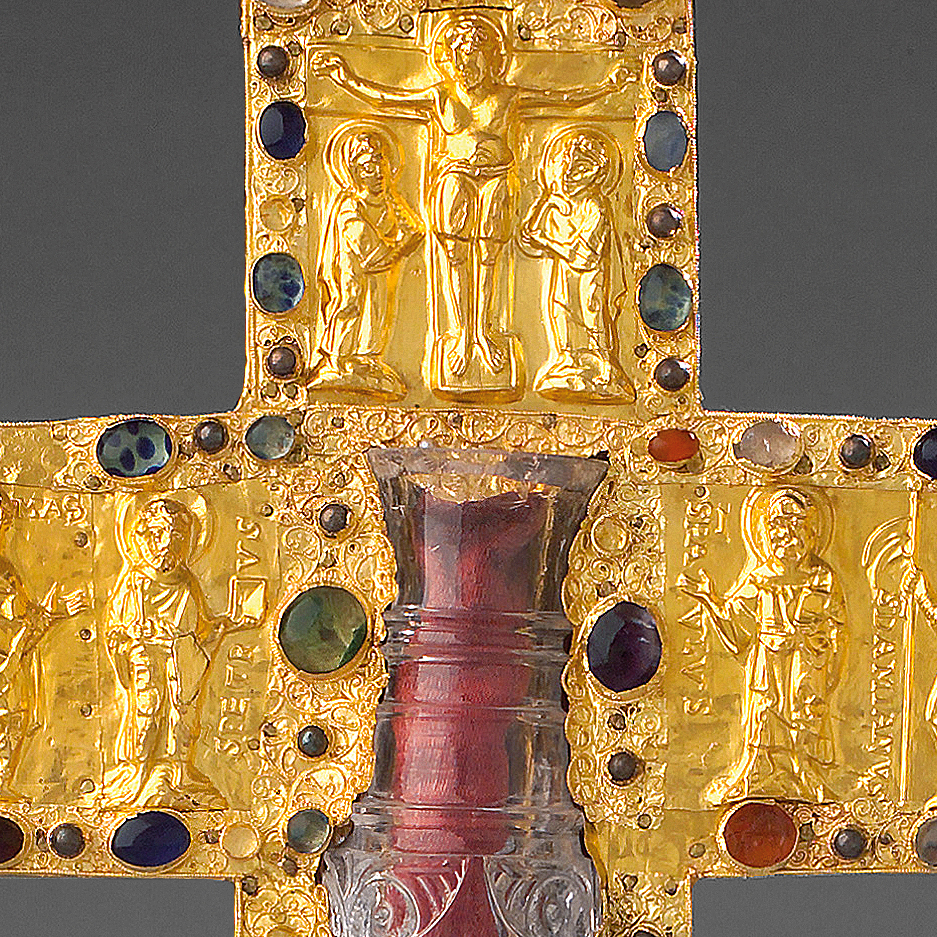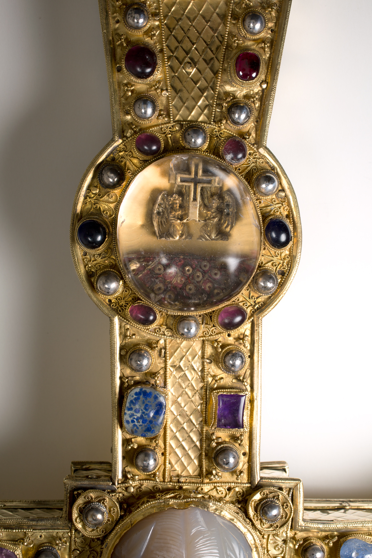- Utrecht, Museum Catharijneconvent, Inv. Nr. ABM h2. Zuletzt abgebildet im Ausstellungskatalog Islam in Europa 2022, 73. Für Informationen aus den Museumsakten danke ich Christiaan Veldman. Als Bergkristall eingestuft wird das Material eines kleineren Steins links oben über dem linken Kreuzarm, der ungewöhnlicherweise ein blaues Bohrloch hat: wurde hier ein blauer Einschluss angebohrt oder wurde der Bohrkanal absichtlich blau gefärbt ? ⮭