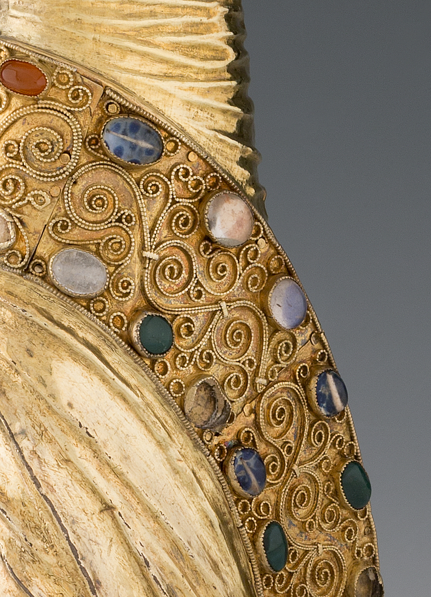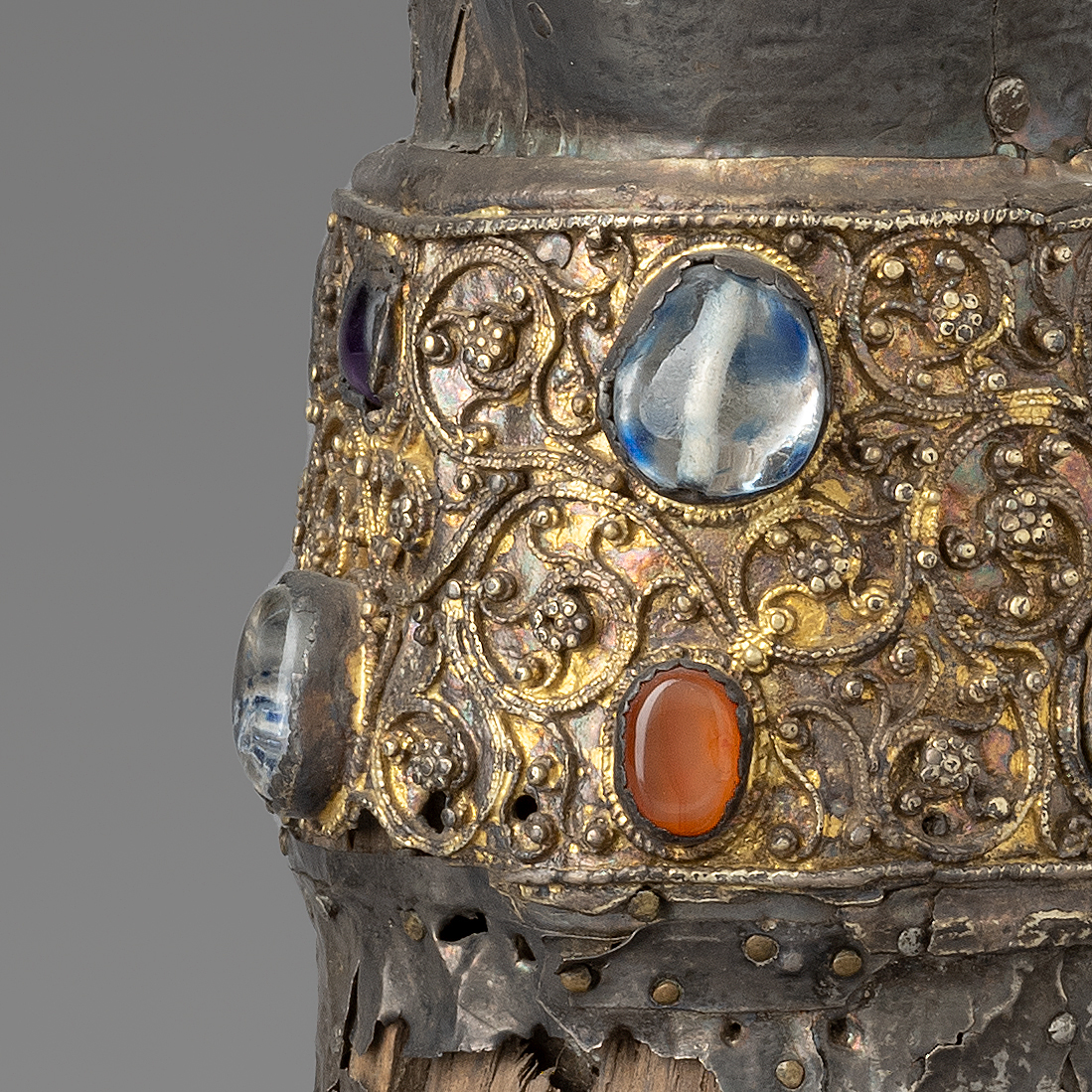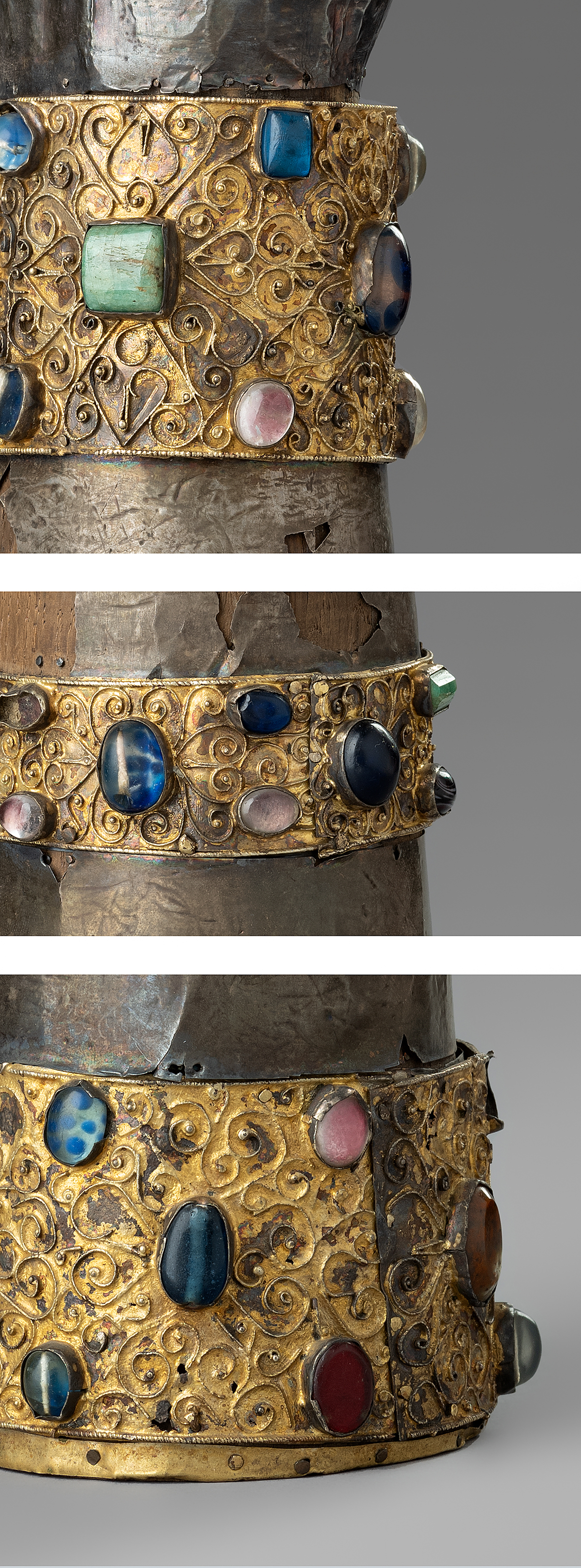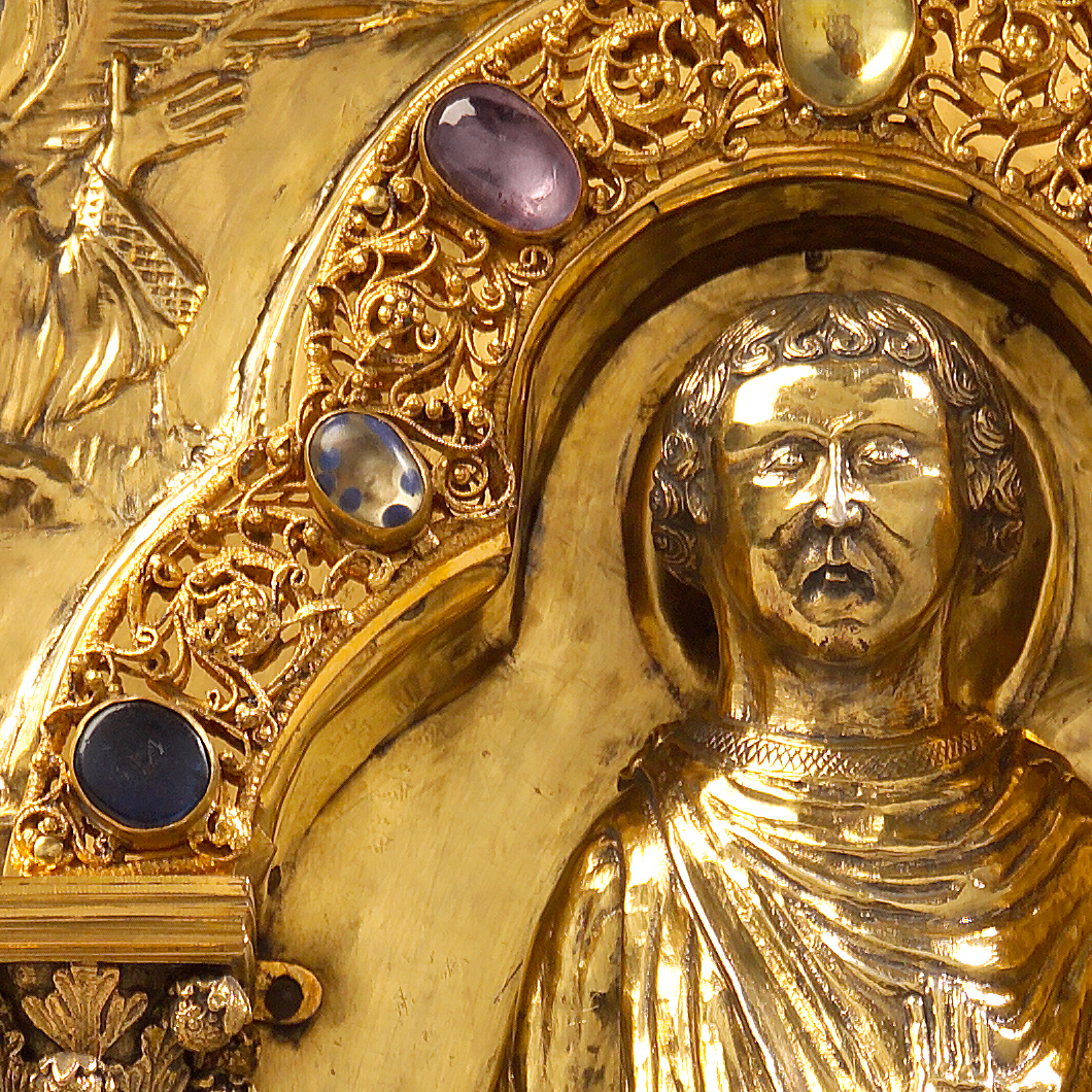 Beim „Kreuz Heinrichs des Löwen“ aus der Stiftskirche zum Hl. Kreuz in Hildesheim (um 1180/1190)22 sitzt links oben auf dem Quadrat am Ende des linken Kreuzarms ein durchbohrter Glasstein, durch dessen klare Glasmasse die blauen Einschlüsse (wohl in Form von Kügelchen) gut zu erkennen sind (Abb. 9). Zwar wurde das Kreuz im Laufe der Jahrhunderte mehrfach verändert, was unter anderem auch den Steinbesatz betraf, dieses Exemplar gehört aber wieder ziemlich sicher zum ursprünglichen Bestand. Ebenfalls in Hildesheim wurde gegen Ende des 12. Jahrhunderts, nach der Erhebung der Gebeine des hl. Bernward, ein „Reliquiar für den rechten Arm“ dieses Heiligen geschaffen.23 Dort finden sich auf den mit Filigran und Schmucksteinen reich verzierten Gewandborten mindestens fünf der Glassteine mit blauen Einschlüssen, Exemplare mit und ohne Durchbohrung (Abb. 10).