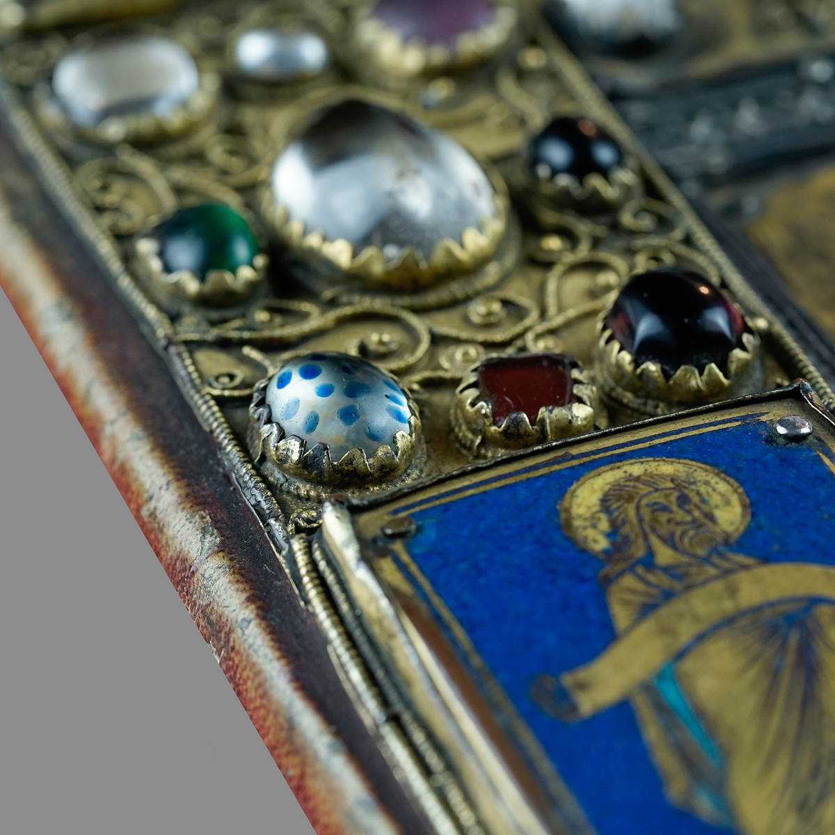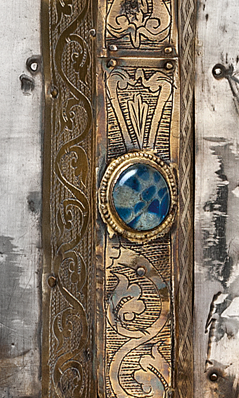 Deutliche runde Punkte finden sich erstmals bei einem Cabochon auf dem linken Kreuzarm des „Borghorster Kreuzes“ (Mitte 11. Jahrhundert) (Abb. 3), neben anderen Glassteinen mit unregelmäßigen blauen Flecken an diesem Kreuz.11 Blaue Einschlüsse in Form von Punkten werden dann an kirchlichen Objekten aus dem späten 11. und frühen 12. Jahrhundert häufiger. Ein besonders schönes Beispiel ist der Stein in einem kleinen „Reliquienkreuz“ in der Wyvern Collection (Westfalen?, um 1100) (Abb. 4),12 dessen runde blaue Flecken die „Ausgangspunkte“ für meine Beschäftigung mit diesem Schmuckstein-Typ waren. Die Punkte sind hier besonders auffällig, da der Stein ungewöhnlicherweise keinen Metallhintergrund hat, sondern in Durchsicht zu sehen ist. An den „Armreliquiaren“ der hll. Crispinus und Crispianus im Osnabrücker Domschatz (Anfang 12. Jahrhundert)13 kommen eine ganze Reihe der Glassteine mit blauen Einschlüssen vor, so z. B. beim linken Arm auf der oberen Manschette einer aus ausnahmsweise blass violettem Glas, auf der mittleren einer mit blauen Flecken und auf der unteren einer mit deutlichen blauen Punkten (Abb. 5). An einem weiteren Armreliquiar in Osnabrück, dem wohl etwas jüngeren „Armreliquiar mit Kreuzpartikel“14, finden sich je ein Cabochon mit sehr kleinen blauen Sprenkeln und einer mit runden blauen Flecken (in der obersten Reihe der oberen Manschette) (Abb. 6). Wichtig ist ein Stein mit blauen Punkten (Abb. 7a, b) am „Schrein des hl. Godehard“ in Hildesheim, der im Anschluss an seine Heiligsprechung 1131 und an die Graböffnung 1132 geschaffen wurde.15 Der Schrein wurde im 16. Jahrhundert beraubt und seit dem späteren 18. Jahrhundert mehrfach restauriert und verändert. Dank der Zugehörigkeit zum Typ der Glassteine mit blauen Einschlüssen ist aber dieser Cabochon16 eindeutig mittelalterlich und war höchstwahrscheinlich Teil der ursprünglichen Ausstattung. Im Rahmen der jüngsten Untersuchungen des Schreins wurde der Stein mit den blauen Punkten ausgefasst und per Röntgenfluoreszenz analysiert (s. u.).17 Durch eine glücklicherweise erhaltene Arbeitsaufnahme ist ausnahmsweise auch seine Rückseite dokumentiert. Obgleich leider wenig deutlich, lässt das Foto zumindest erkennen, dass die blauen Einschlüsse in unterschiedlicher Höhe eingebettet sind und durch die Cabochonform erheblich verzerrt erscheinen (was von oben gesehen Punkte sind, erscheint von unten als verschwommene Flecken). In einem Fall scheint ein ein blaues „Kügelchen“ unten leicht hervorzuragen.18 Von oben ist auch nicht zu erkennen, dass der Stein teilweise durchbohrt wurde, wobei es vermutlich zu dem Ausbruch an einer Seite kam.19 Ebenfalls durchbohrt ist ein ovaler Glasstein auf dem Deckel des „Evangeliars mit kostbarem Bucheinband“ in Braunschweig (außen auf dem rechten Rand, über dem unteren Eckquadrat).20 Der Einband wie auch die Handschrift sind wohl im dritten Viertel des 12. Jahrhunderts in „Niedersachsen (Braunschweig?)“ entstanden. Bei diesem Stein liegen die blauen Einschlüsse tatsächlich ziemlich weit unten, unter dem Bohrloch, sie erscheinen hier nicht punktförmig, sondern als unregelmäßige Flecken. Ein deutliches Punktmuster hat dagegen ein derartiger Glasstein auf dem Prunkeinband des „Evangeliars Cod. 140“ im Trierer Domschatz (Abb. 8), das ebenfalls in die zweite Hälfte (oder ins letzte Drittel) des 12. Jahrhunderts datiert wird.21 Ursprünglich stammt dieses Evangeliar aus St. Godehard in Hildesheim, nach Trier gelangte es erst 1823 als Geschenk des Paderborner und Hildesheimer Domkapitulars Graf Christoph von Kesselstatt. Bei diesem relativ hoch gewölbten Stein „schwimmen“ die blauen Punkte ziemlich dicht unter der Oberfläche, die meisten sind kreisrund, einige leicht oval verzogen.
