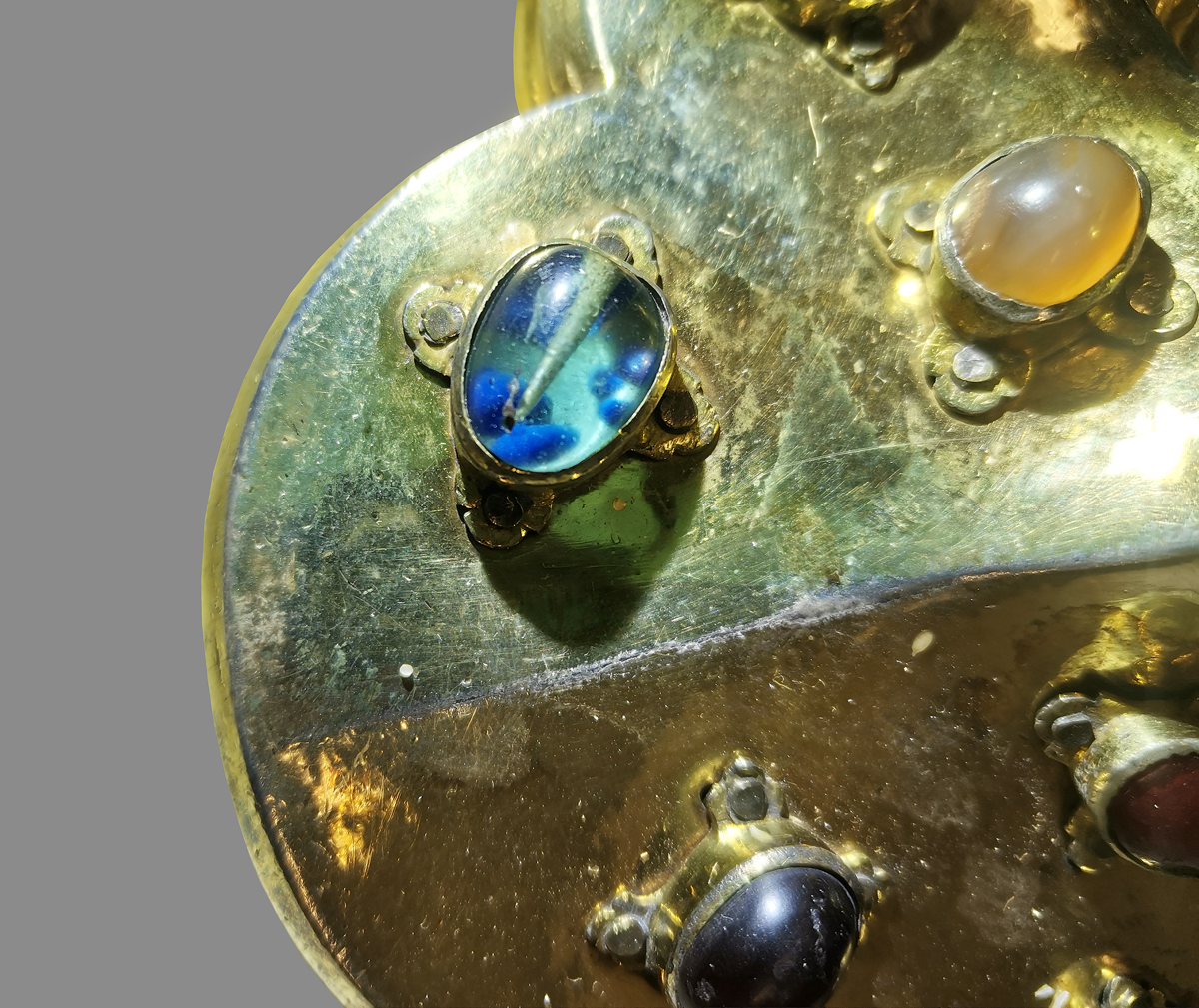 - Bei Helmich beschrieben als „Cabochon mit rückseitig angeschmolzenen blauen Glaspunkten“. Unten leicht herausragende „Kügelchen“ an solchen Glassteinen wurden auch von Restaurator Uwe Schuchardt bei der Restaurierung verschiedener Objekte beobachtet, aber leider nicht dokumentiert. ⮭