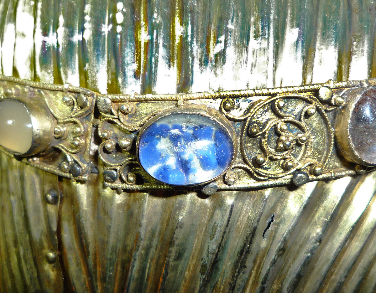 2006 publizierten Louise Joyner und Ian Freestone die Ergebnisse ihrer Analysen der Schmucksteine auf dem „Kopfreliquiar des hl. Eustachius“ im British Museum, die zu ähnlichen Ergebnissen führten.59 Außer natürlichen Steinen, einer Perle, je einem “Stein“ aus Perlmutt und aus Obsidian finden sich dort ein Cabochon aus rotem Holzascheglas und fünf weitere in verschiedenen Farben aus Natronglas, darunter der erwähnte Glasstein mit blauen Einschlüssen.