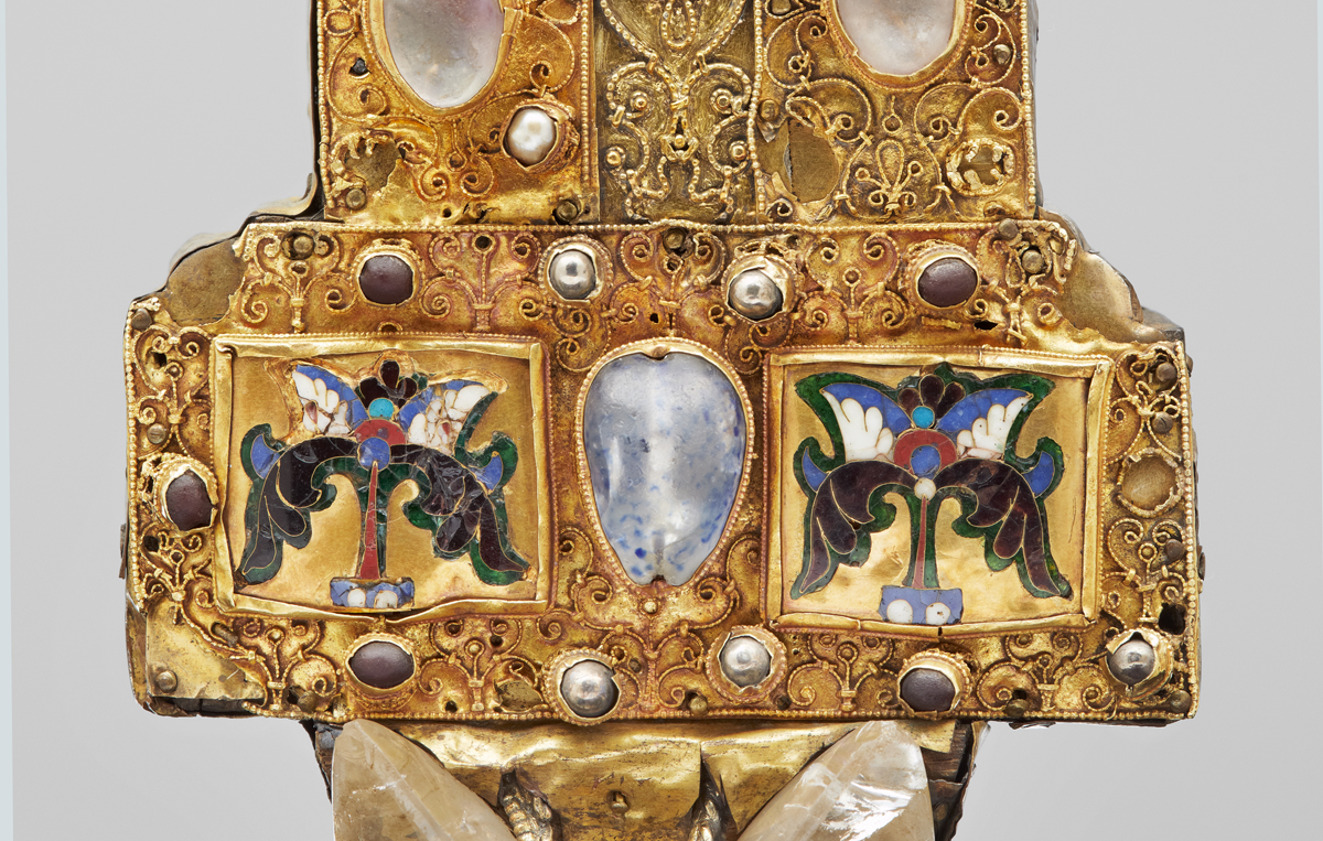 Weitere frühe Beispiele von Glassteinen mit blauen Einschlüssen finden sich auf dem „Heinrichskreuz“ aus dem Basler Münsterschatz, das wohl um 1020 geschaffen (und später mehrfach verändert) wurde.5 Besonders auffällig ist dabei ein relativ flacher ovaler Cabochon auf dem linken Rand oberhalb der Vierung (Abb. 1):6 In die farblose Glasmasse sind dort, ziemlich dicht unter der Oberfläche, zahlreiche unregelmäßige „Krümel“ von blauem Glas eingeschmolzen. Mehrere kleinere „Steine“ auf diesem Kreuz sind ähnlich gemustert.