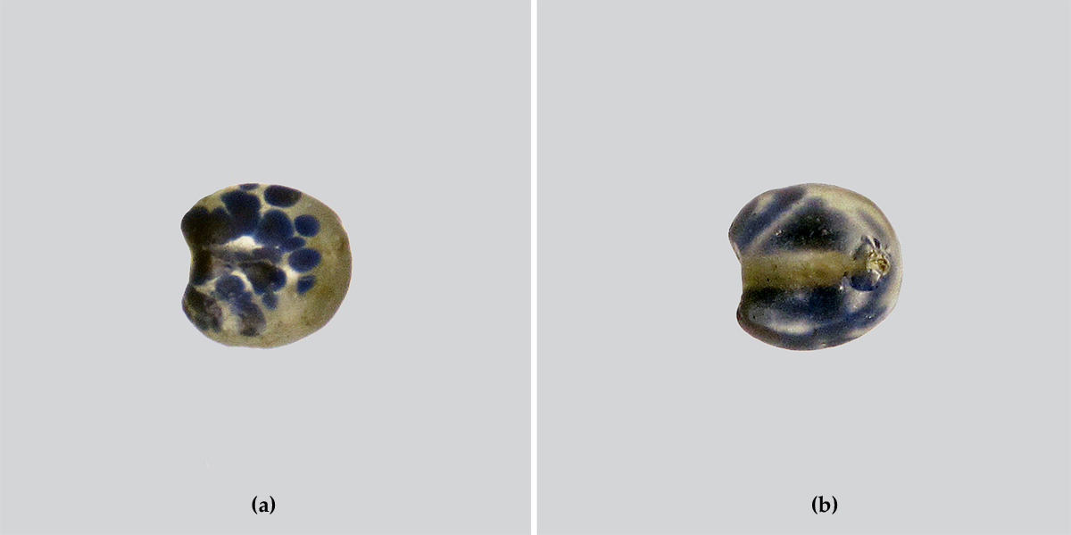 Zu den Motiven für die Herstellung von Glassteinen mit blauen Einschlüssen kann man wieder nur Vermutungen anstellen. Sofern überhaupt wahrgenommen galten sie bisher als Saphir-Nachahmungen, vor allem weil Saphire von Sri Lanka (Ceylon) häufig ähnlich fleckig erscheinen.74 Aber es scheint mir zweifelhaft, dass man im Mittelalter tatsächlich zugunsten von täuschender Ähnlichkeit bewusst nicht-makellose Schmucksteine herstellte. Möglicherweise waren die blauen Einschlüsse eher technisch bedingt: Wenn unter dem verfügbaren „Rohglas“ neben farblosem Glas nur opak blaues Glas vorhanden war, so konnte man davon nur kleine Partikel oder Kügelchen beimengen, damit der Stein hellblau erschien, aber durchscheinend blieb, ähnlich einem Saphir.
