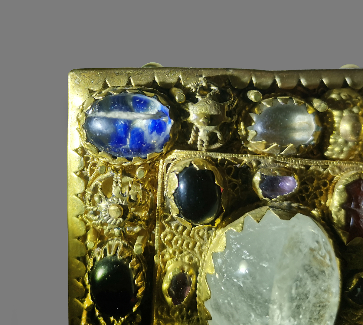 An einigen der ottonischen Goldschmiedewerke in der Schatzkammer des Essener Doms erscheinen blaue Einschlüsse in farblosen Glassteinen entweder als winzige Sprenkel, z. B. bei einem Exemplar unten am „Theophanu-Kreuz“ (um 1040/45) (Abb. 2),7 oder als größere verschwommene Flecken, so z. B. bei zwei kleinen Cabochons oberhalb der Vierung desselben Kreuzes, bei mehreren Steinen auf dem „Kreuznagelreliquiar“ (Emailseite)8, eventuell auch auf dem Deckel des „Theophanu-Evangeliars“ (Mitte 11. Jahrhundert).9 Auch am „Kapitelkreuz“ im Osnabrücker Domschatz (erste Hälfte 11. Jahrhundert) gibt es am Kreuzstamm einen Stein mit winzigen blauen Sprenkeln (Stein Nr. 89) und einen weiteren mit blauen Flecken am rechten Kreuzarm (Stein Nr. 64).10
