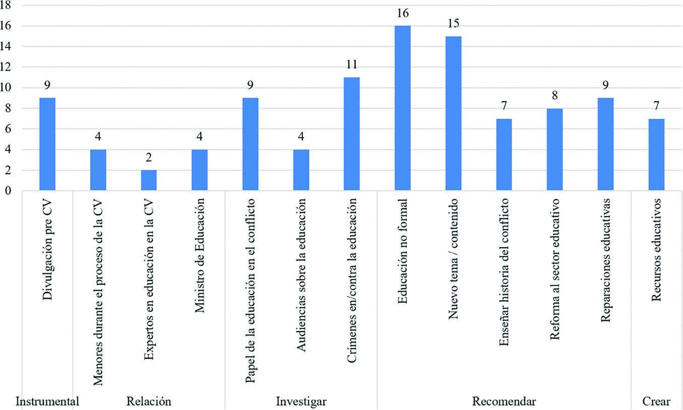 Este artículo intenta abordar este problema. Para ello, realizaremos un análisis de contenido de veinte informes producidos por comisiones de la verdad entre 1980 y 2015. Nuestros objetivos son: 1) identificar las diversas maneras en que las comisiones de la verdad han intervenido en la educación, 2) examinar si dichas intervenciones han cambiado con el tiempo, y cómo, y 3) considerar las posibilidades de cumplir con la intención asumida por las comisiones de la verdad de efectuar un cambio en el futuro al revelar las verdades del pasado a través del trabajo con la educación.