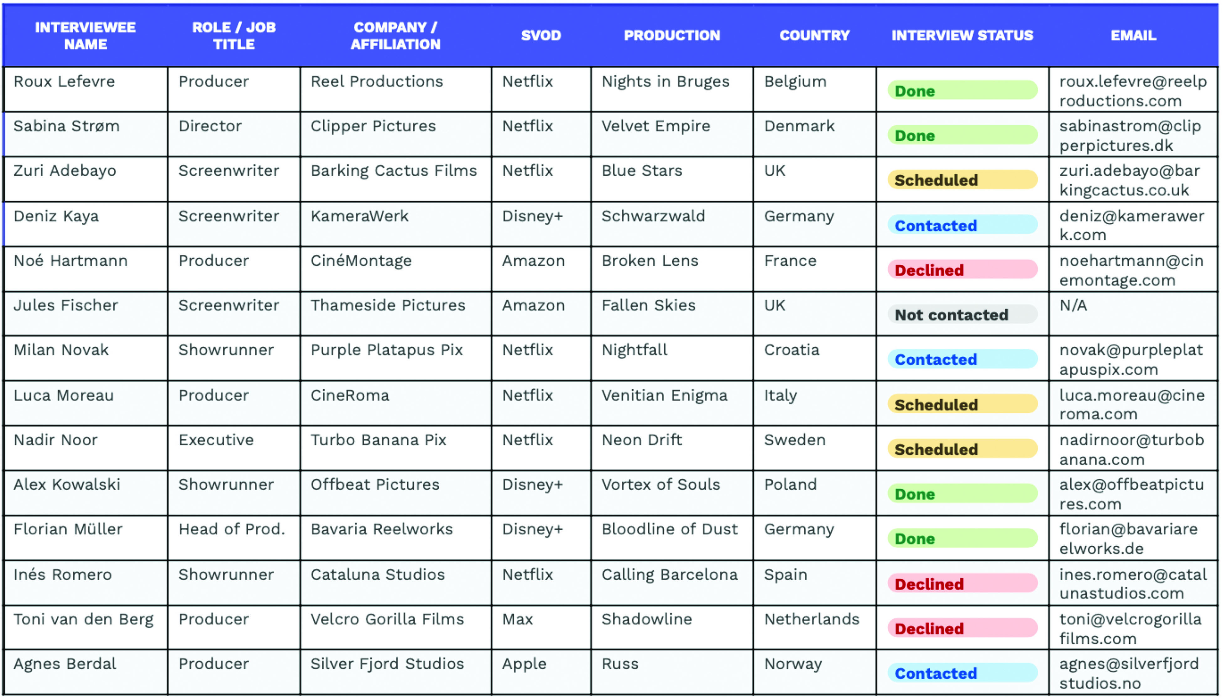 Both Nina and Daphne ventured into production studies as PhD students with little connection to the production cultures they were researching. Identifying potential interviewees is one thing. Obtaining contact details and securing an interview with these “exclusive informants”28 is quite another. This becomes all the more challenging in a streaming context, where local producers are acutely aware of the risks associated with disclosing their experiences with major companies like Netflix or Amazon, stemming from significant power asymmetries and dependencies. This section highlights our most useful strategies to help mitigate some of these challenges.