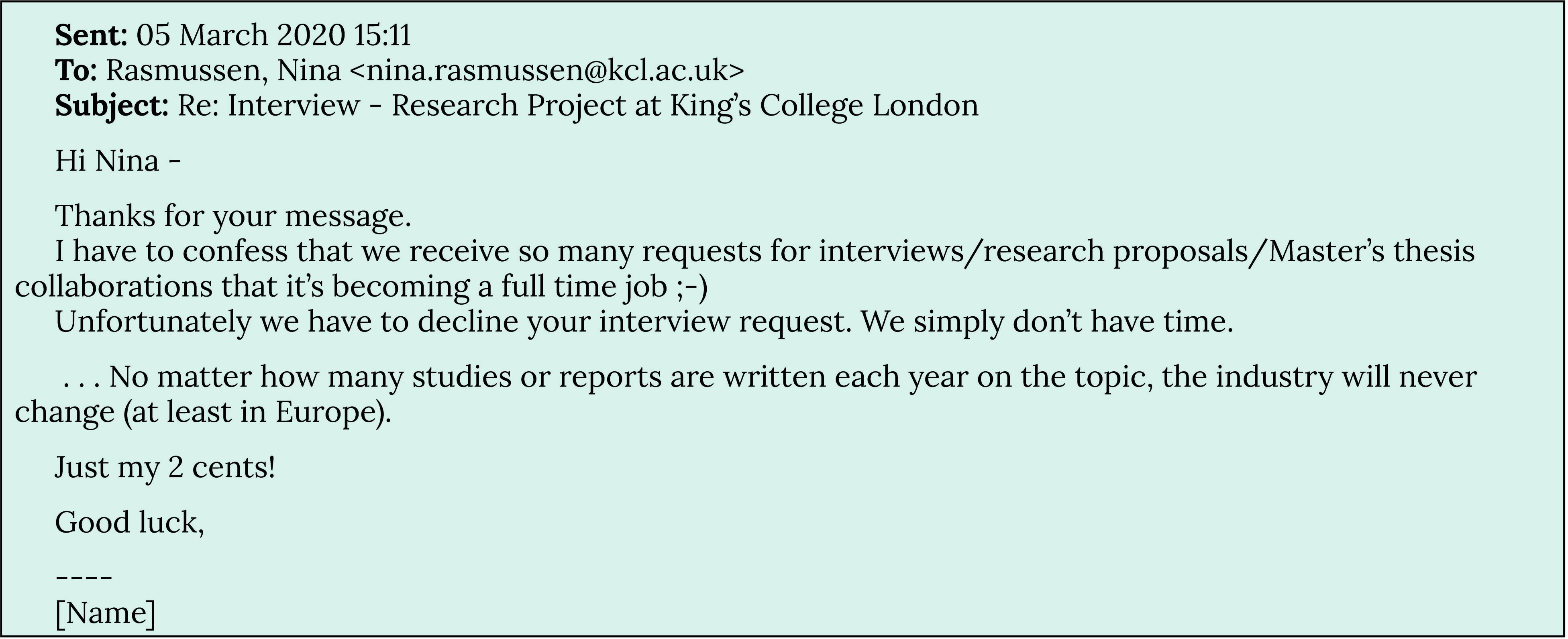 In our own case, we have confronted various aspects of our positionality throughout our production studies. As female researchers in our early thirties, we have especially noticed how our age and career stage have impacted the fieldwork. For instance, a few participants referred to the research as a “school project,” suggesting that it was perceived as part of our learning process rather than a formal academic study. It has also influenced our access–or lack thereof–to specific individuals within the industry. For instance, Nina emailed more than one hundred screen workers in her search for participants. A large number did not reply, while eleven declined for various reasons. One executive noted the high volume of emails from academics and students, while also expressing skepticism about the ability of research to bring about meaningful change in the sector (Figure 2).