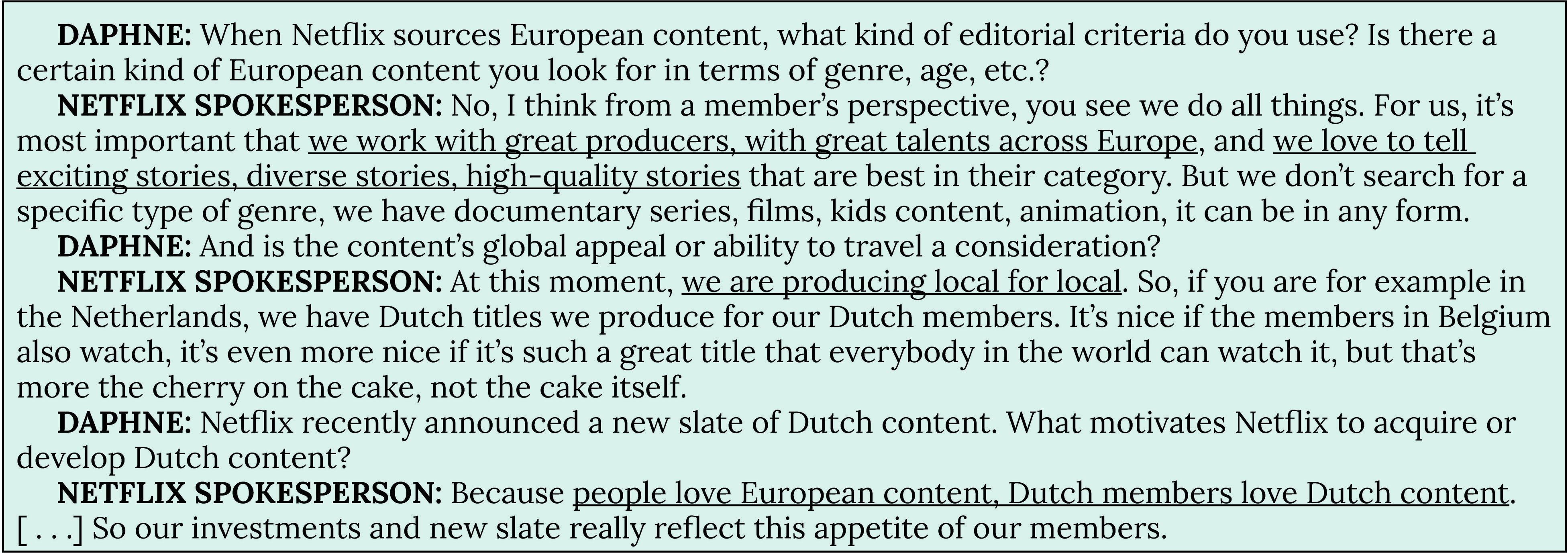Finally, in conducting research into streaming production cultures, it is likely you will at some point encounter “spokesperson speak.” We use this term to capture interviews not only with actual spokespeople but also with certain executives/creatives/producers who are more rehearsed, guarded, and trained in their responses. These individuals may be making statements on behalf of a streaming service or production company and have a vested interest in what they are sharing. Figure 3 exemplifies “spokesperson speak” in action. In this dialog, we have underlined segments that echo statements in press releases and were repeated nearly verbatim by other interviewees when discussing Netflix’s European content policy. At the time of conducting this research in 2021, there was a heated debate in the Dutch media industry around the implementation of the amended Audiovisual Media Services Directive. Netflix, local broadcasters, and production companies were actively lobbying for different definitions and obligations that would be most beneficial to them. Capitalizing on that particular moment, these entities were more accessible and willing to participate in this research project, as it provided them with another outlet to argue their case. A few years later, Daphne contacted the same interviewee for a different research project that was not related to any current affairs. She received no response.