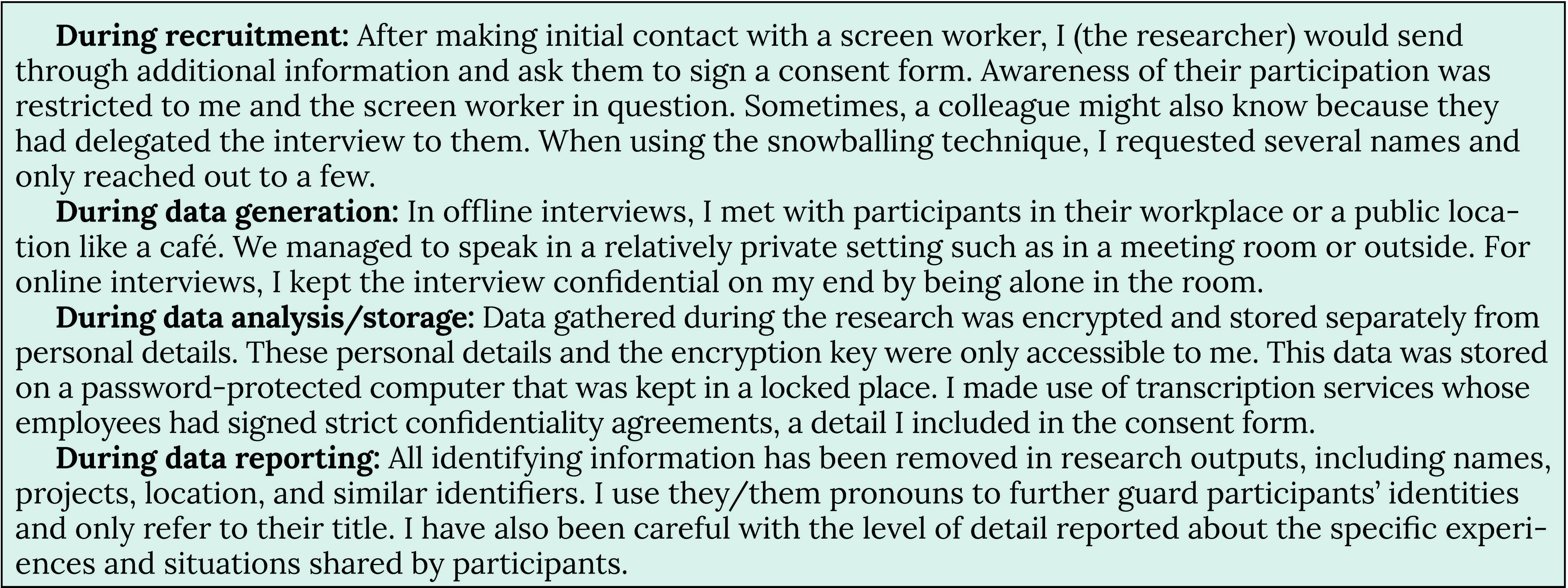 As already mentioned, screen workers usually sign strict NDAs, meaning they are prohibited from sharing information or materials that have been deemed confidential by the streamer in question. In other words, these workers may face professional or legal repercussions if they breach their NDAs. This introduces an ethical concern for researchers carrying out a streaming production study: How can you safeguard the confidentiality of participants while providing sufficient detail about the streaming productions in research outputs? Over-anonymizing the findings can strip important context from the research, potentially losing the nuances and specificities that are central to production studies. Striking the right balance is hard, and it will vary depending on the scope and nature of the project. In Figure 4, we offer one example of what confidentiality measures can look like during recruitment, data generation, data analysis/storage, and data reporting.
