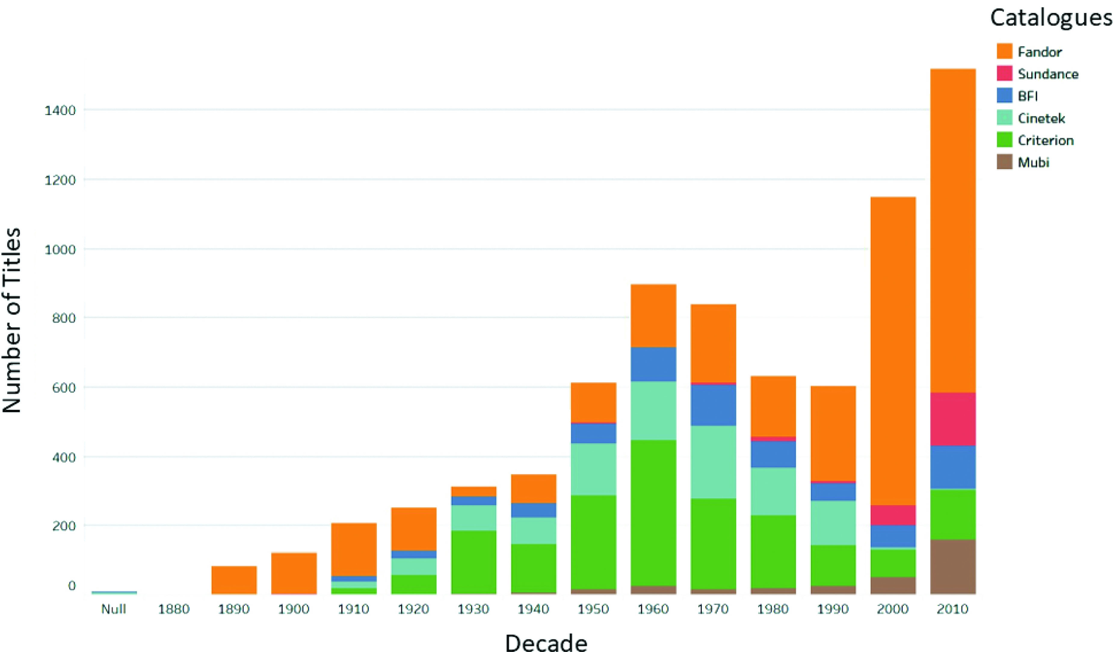 At the time of data collection, the catalogs provided access to the following numbers of films: Fandor (3386), Criterion (1900), LaCinetek (1034), BFI Player (697), Mubi (325), and Sundance Now (244). Figure 2 shows that 40 percent of titles come from the so-called classic period, roughly between 1950 and 1980. If we exclude Fandor’s and its big group of recent titles, it represents the majority of movies offered (54 percent). These figures, influenced by the more voluminous offerings in our corpus, nevertheless conceal other relevant clues.
