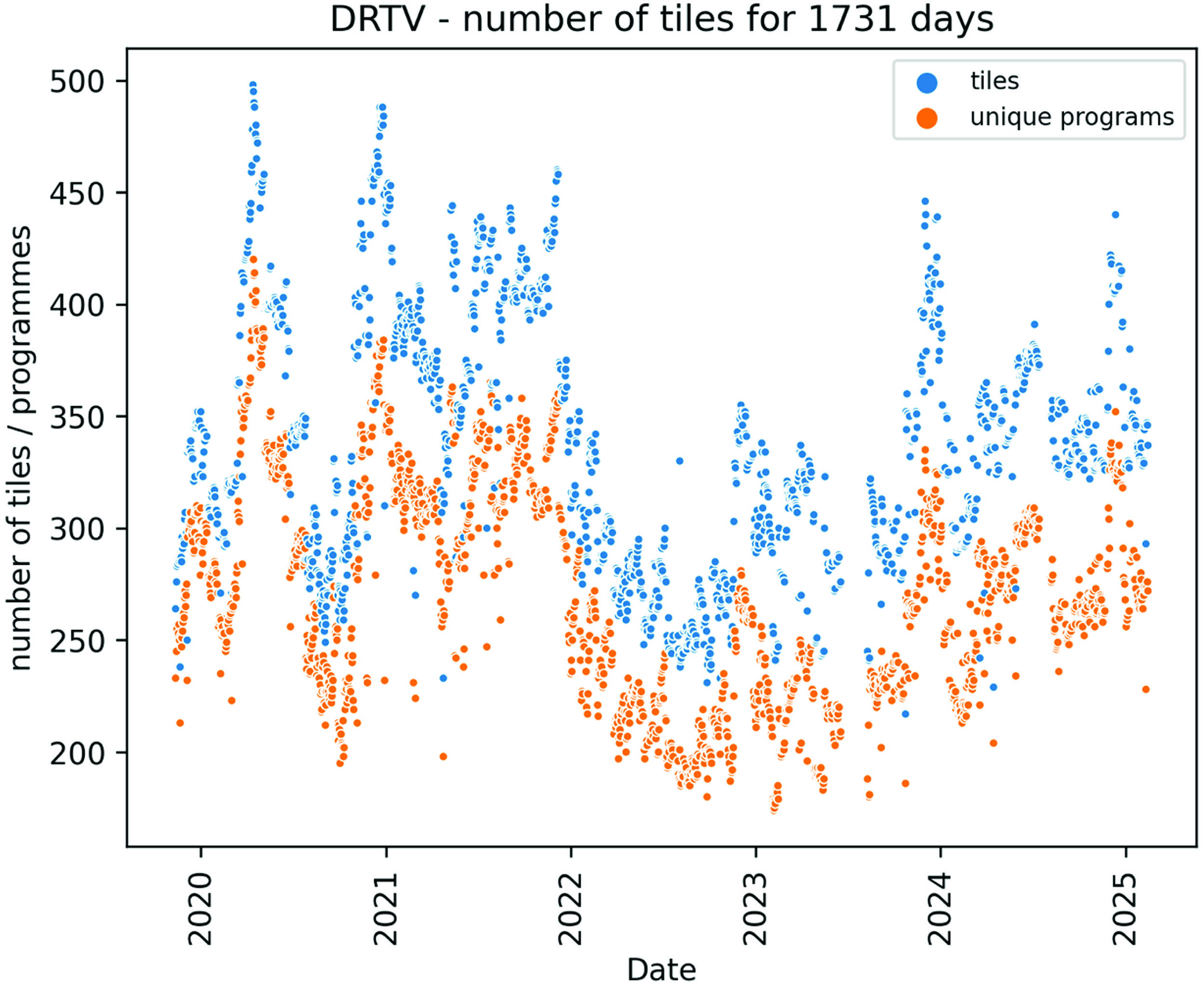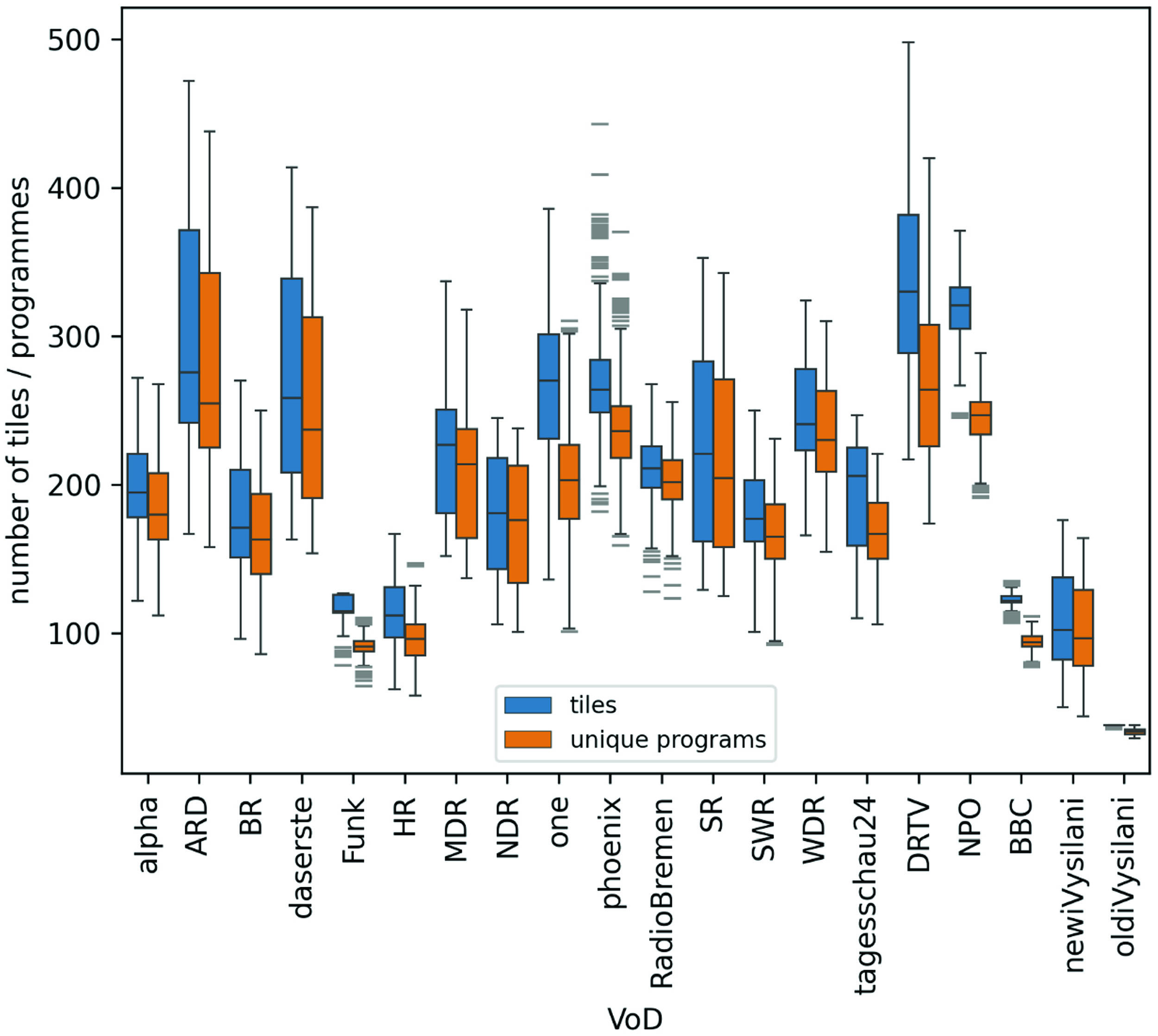 - The documentation of DRTV started on November 12, 2019, but for all other VoDs except “oldiVysilani,” the documentation started in late February 2022. The former version of the Czech TV “iVysilani,” here called “oldiVysilani,” was documented from June 2020 until December 3, 2021, where it was replaced with a new service with a new design and curation policy, in the following referred to as “newiVysilani” (documented from December 6, 2021). As of December 2024, documentation continues, but the datasets used for this article terminate mid-July 2024. ⮭