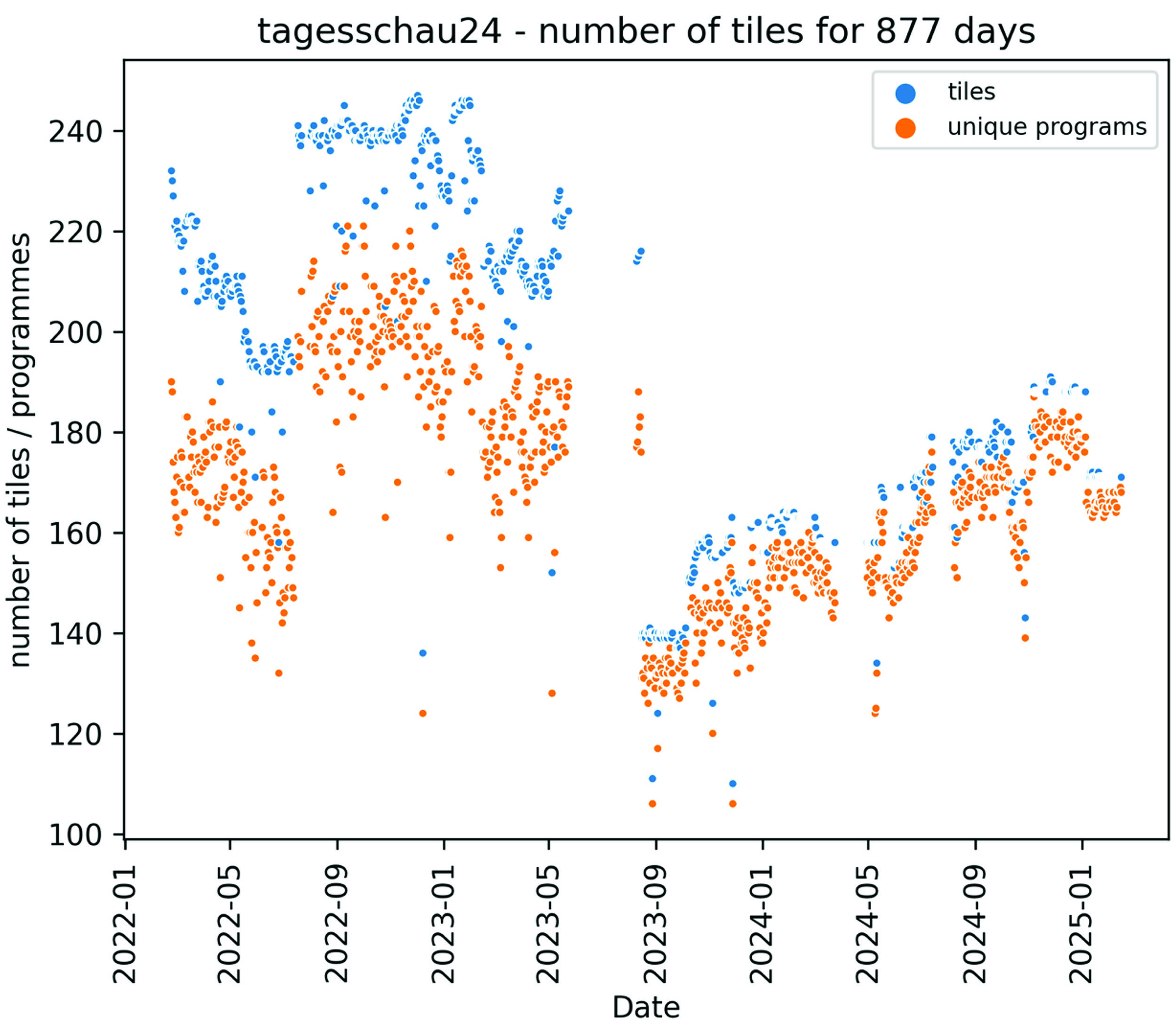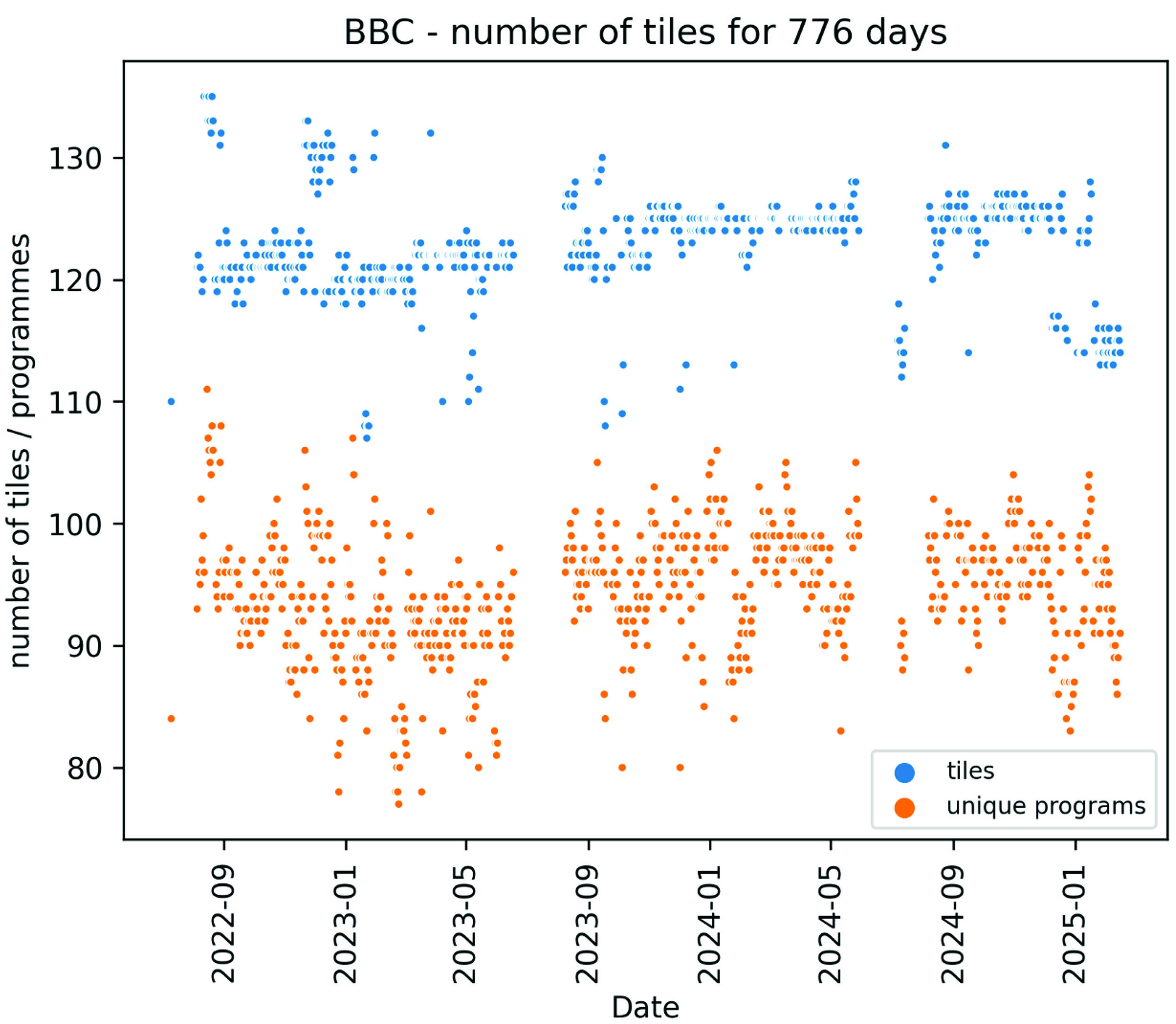 Despite being a relatively new phenomenon, video-on-demand (VoD) services have inspired a large volume of research.2 Being a mediator between viewers and audiovisual content, the interface is an important mediator shaping the user’s experience of the service and for attracting attention to content.3 For commercial VoD services, such as Netflix, optimizing the VoD interface and the content composition via personalization technology is a key to prevent churn and ensure returning customers.4 For noncommercial VoD services, more precisely VoD services offered by public service media (PSM) organizations, churn and user satisfaction are not the only problems. While still fighting for user attention, PSM VoD services have a mission, a history, and a catalog that are very different from those of their commercial competitors. In either case, the current dilemma is a lack of robust methods for auditing VoD services. One approach to auditing focuses on “prominence”–for example, how prominent is a program or program type placed on the page or in an interface.5 One can, for example, assess to which extent a public service media VoD contributes to public value or public service obligations by measuring where in the VoD interface, for example, news, current affairs, or culture content is placed.6 In this article, we explore possible indicators to characterize VoD publishing based on the longitudinal analysis of front pages. By indicator, we mean consistent features that occur across many VoD services and which can thus be analyzed and compared at scale, such as the number of unique programs per day. The objective of this article is to suggest indicators that can characterize public service VoD services specifically.