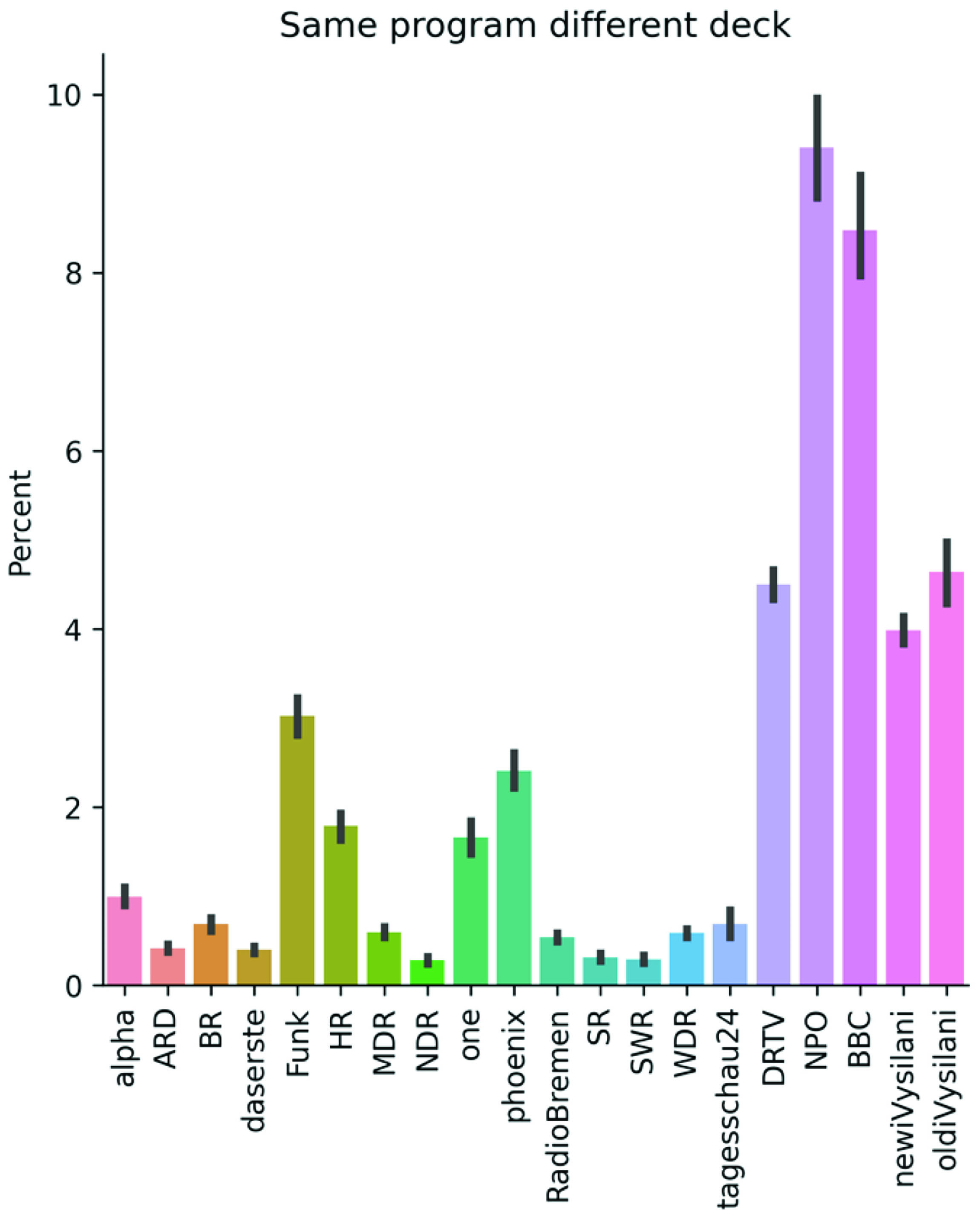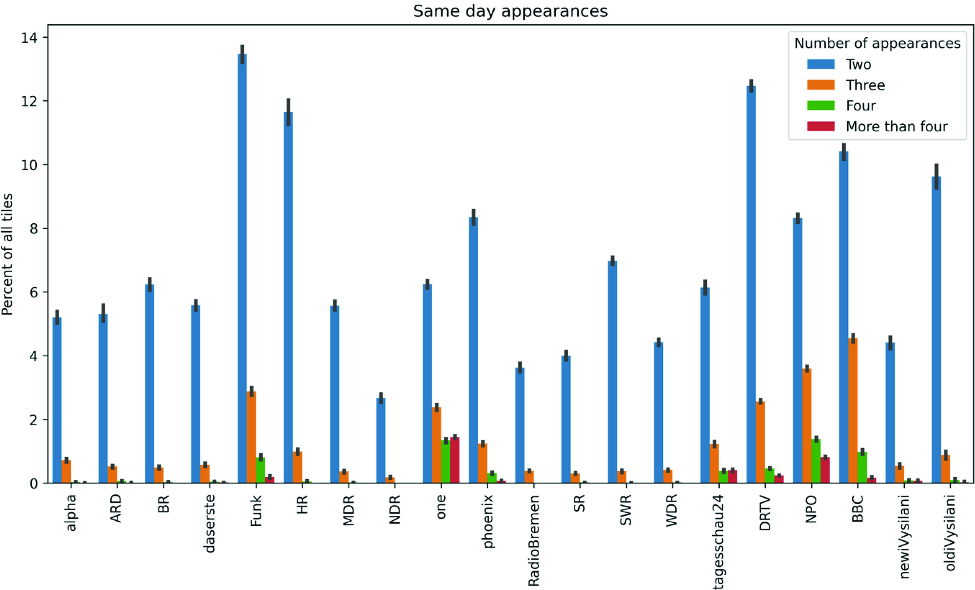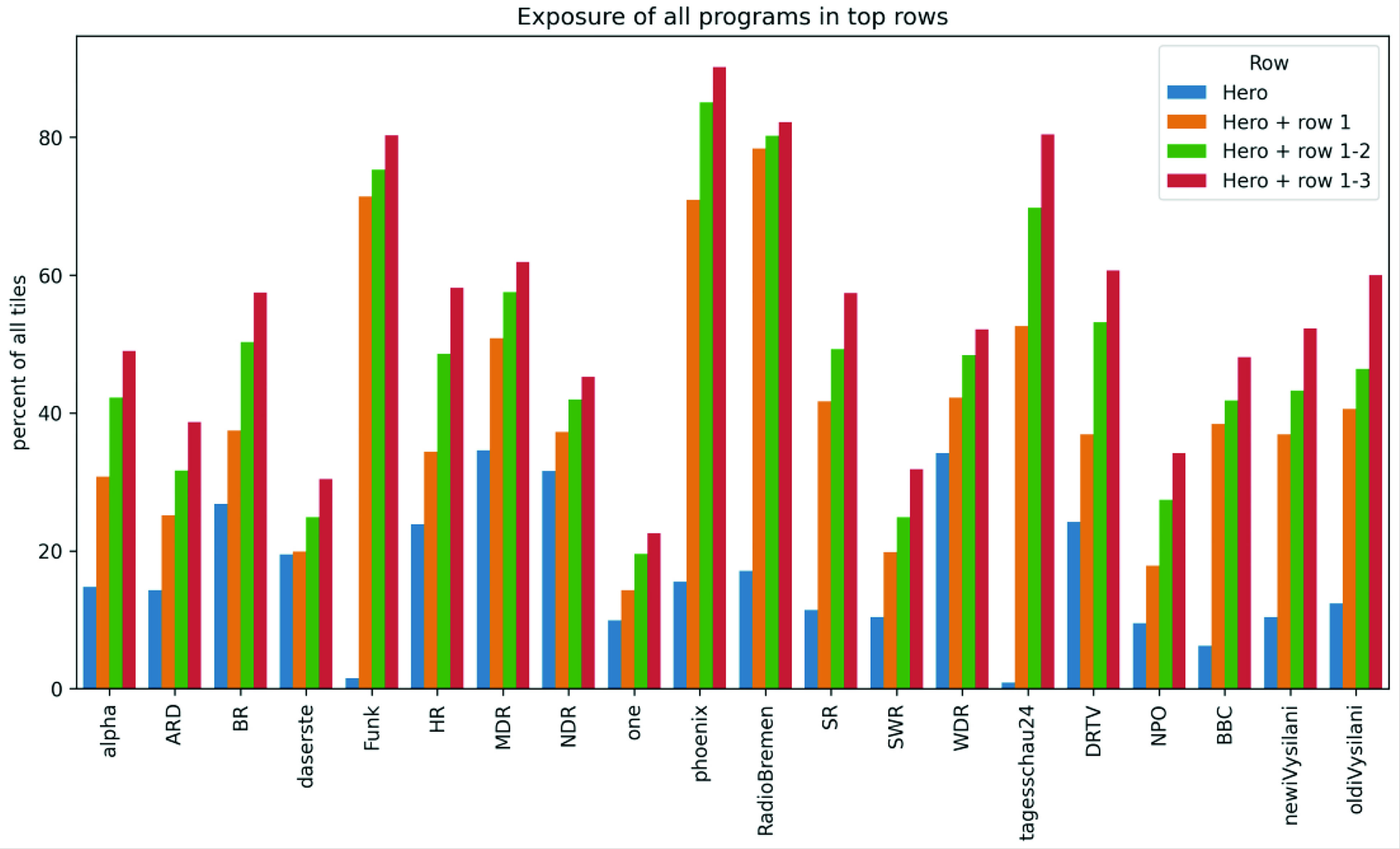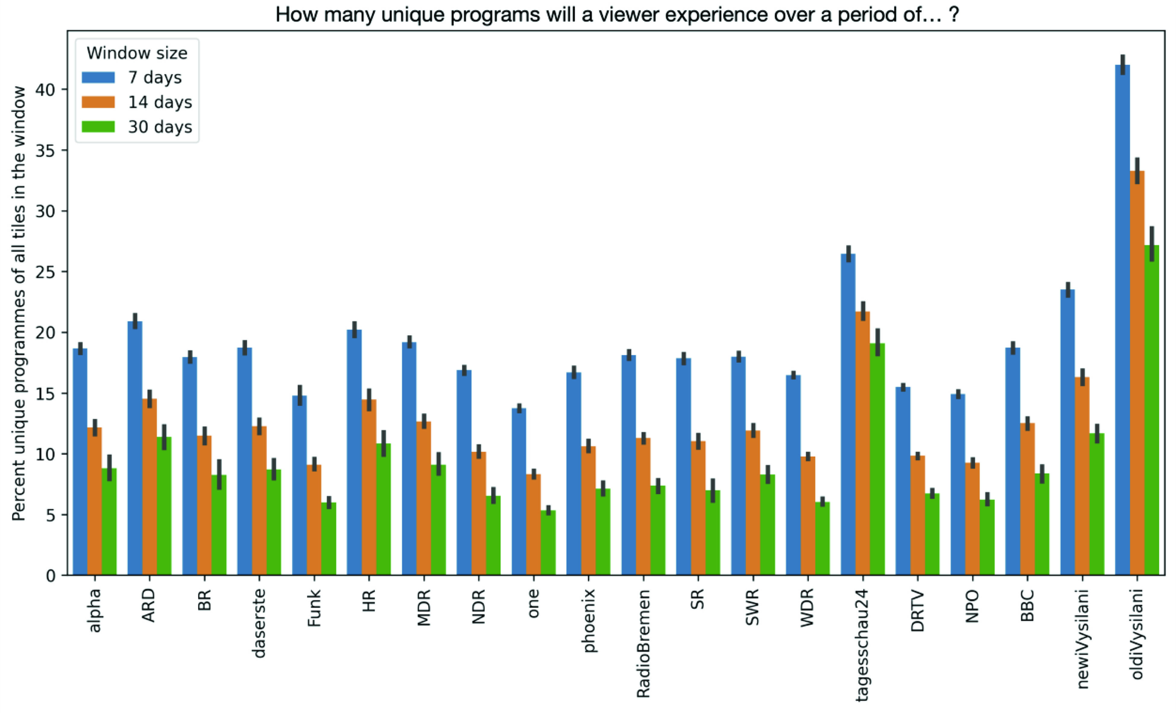 Publishing strategies can also be evaluated by counting how many unique programs featured on the front page over a period of 7 days, 14 days, or a month. In Figure 16, we see again that the old version of iVysilani is a high outlier, meaning that users of that VoD are more likely to find new-to-iVysilani titles on the front page. Conversely, DRTV does not offer much new content.