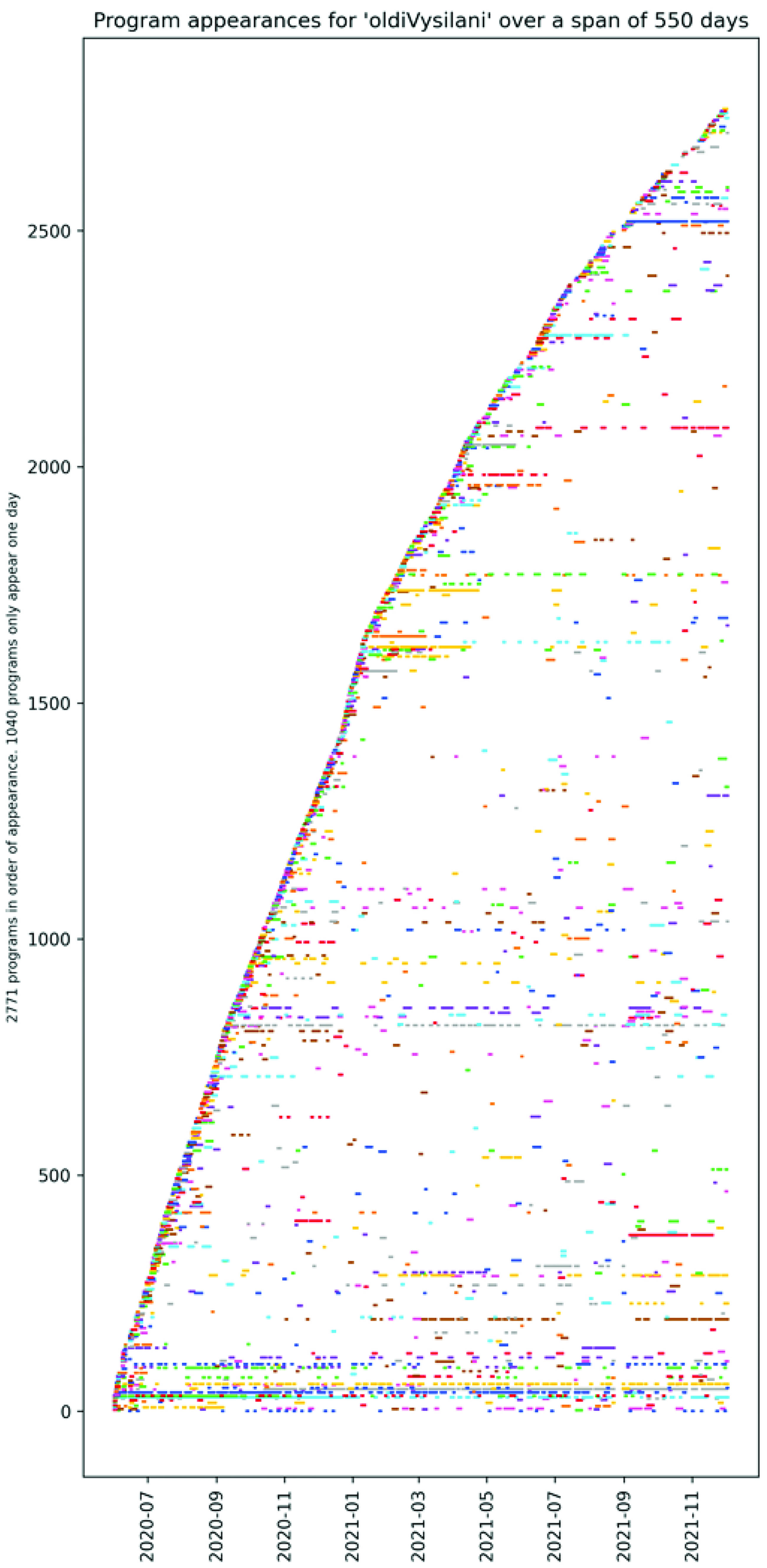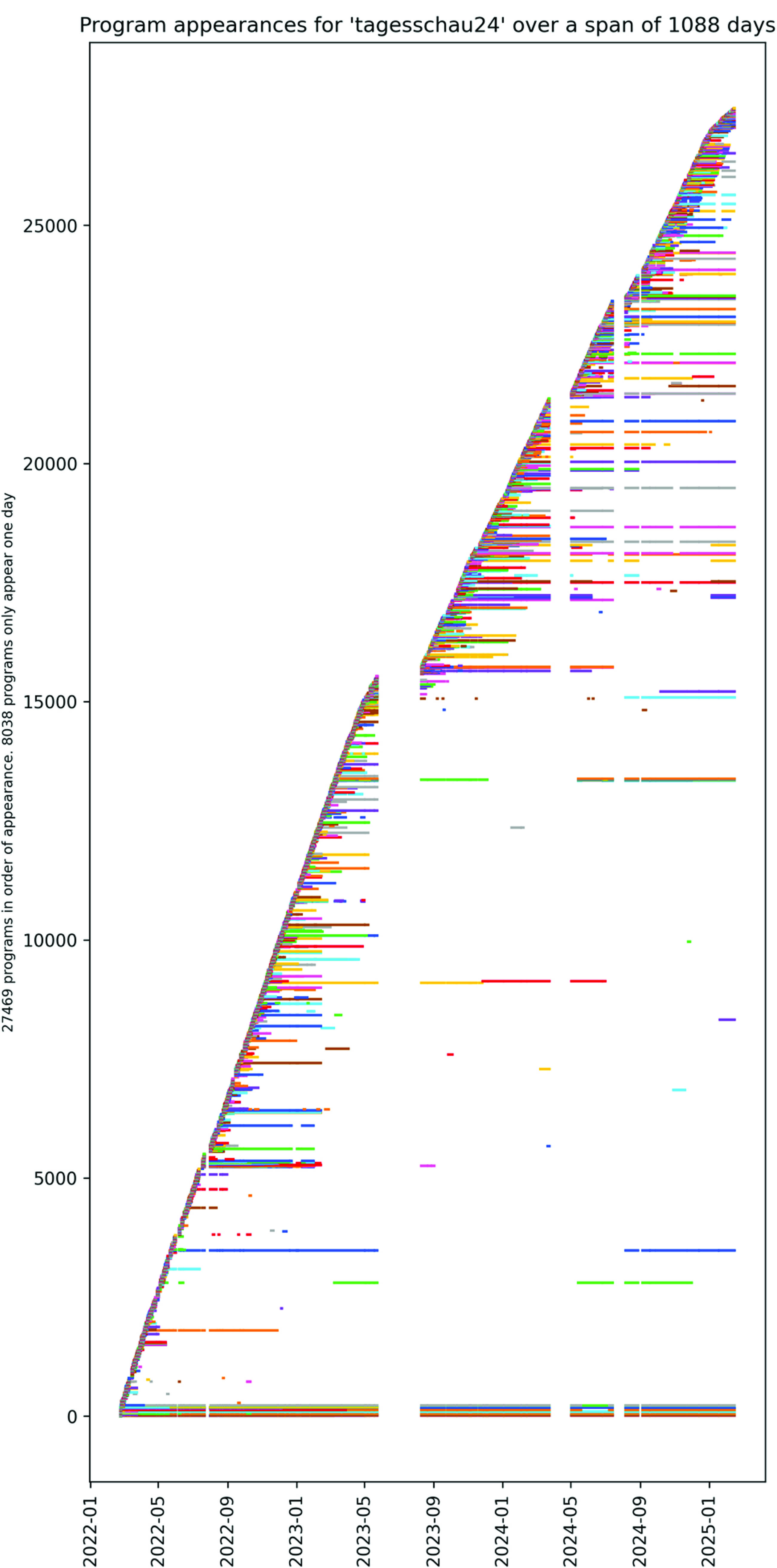 Tables 8–11 plot appearances, disappearances, and reappearances of all program titles across four very different VoD services.18 Each colored line represents a program. To simplify the visualization, we ignore the position of titles in the interface. Immediately we notice patterns in the plots. Each of the four VoD services has a different density in colored lines: Tagesschau24 (Figure 8) has very few programs that reappear, but when introduced programs remain for a relatively long period. This makes sense, as Tagesschau24 is a news-focused VoD. Interestingly, we also see a number of program titles that are visible for a very long period of time, some also reappearing. The old version of iVysilani (Figure 9) has a similar low density but shorter periods of the first appearances of the program, but many reappearances scattered over the timeline. Only a few titles are visible continuously in the entire sampling period. Conversely, DRTV (Figure 10) has a high density with many programs on the front page for a long time. Finally, the VoD Alpha (Figure 11) has been included to illustrate the advantage of the plotting method as the plot shows a peculiar pattern of diagonal series of programs reappearing in a cascading style.*