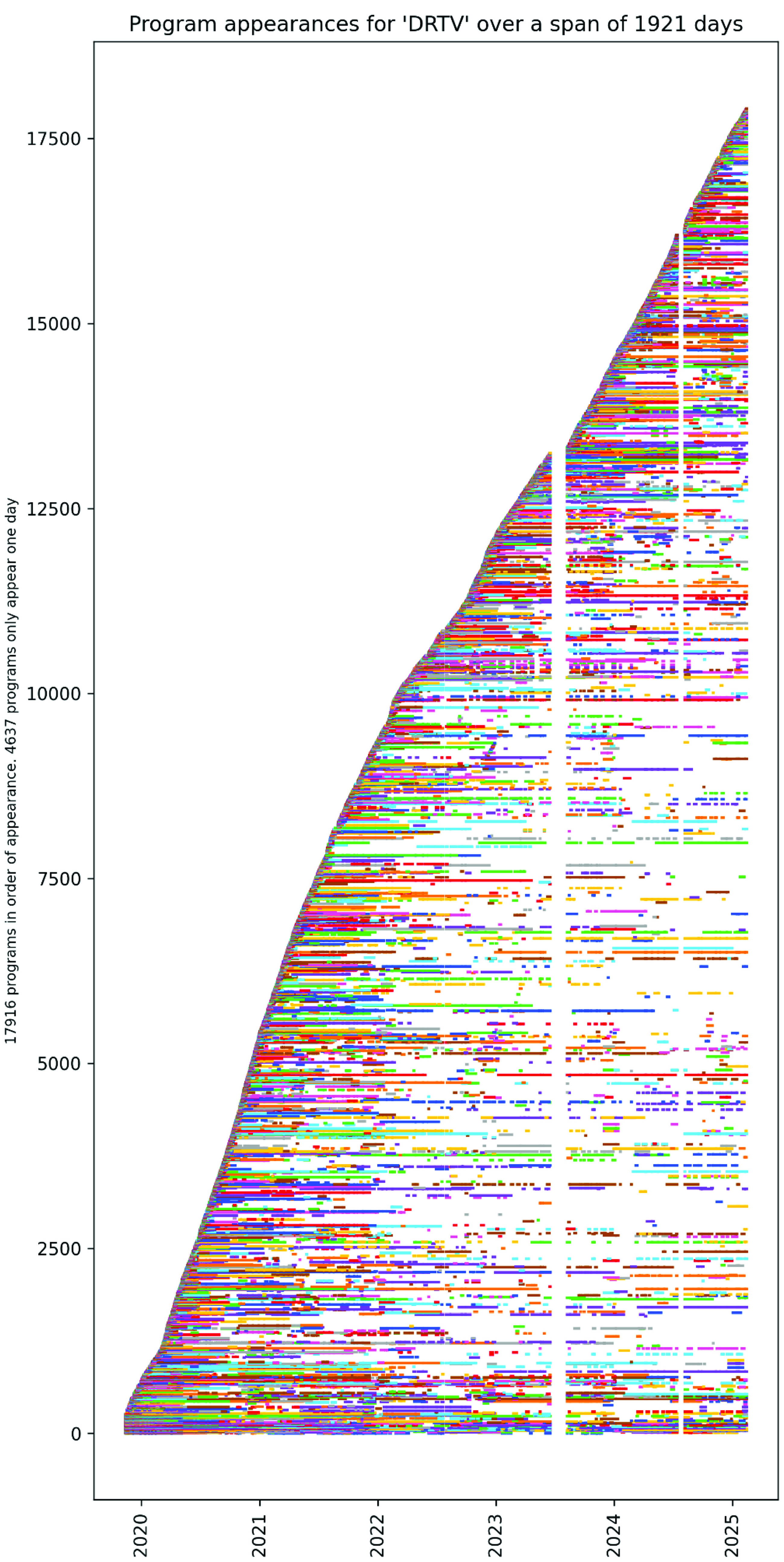 Furthermore, the plots highlight the growth in the number of new titles for each VoD, effectively showcasing the “productivity” of the VoD services. The rugged diagonal line formed by the appearance of each title shows how rapidly new programs arrive to the VoD interface. For DRTV, we see the growth of new program titles reducing after 2022. A similar pattern is visible for “Alpha.” These fluctuations necessitate further research and could find other explanations, for example, in seasonal changes.