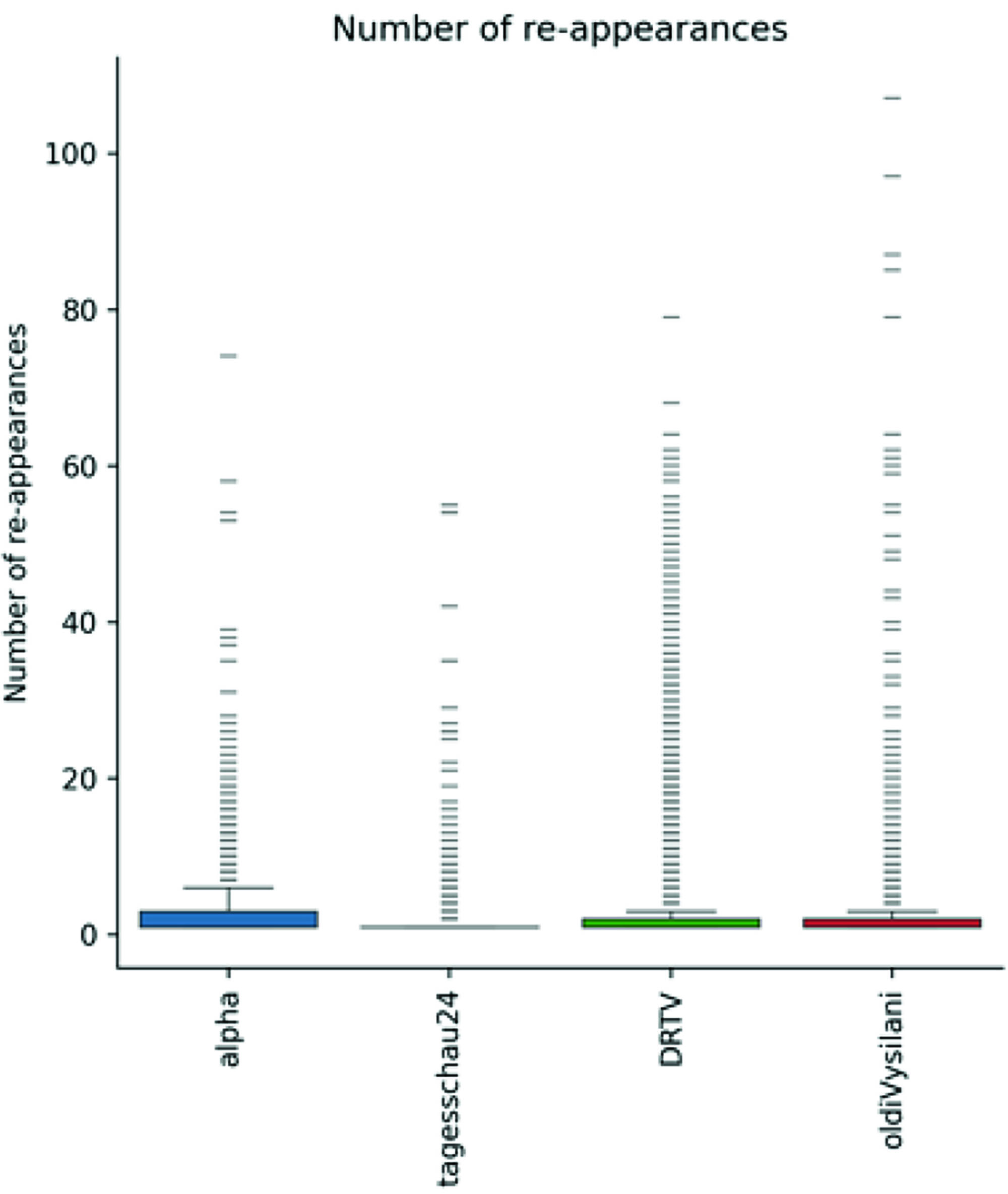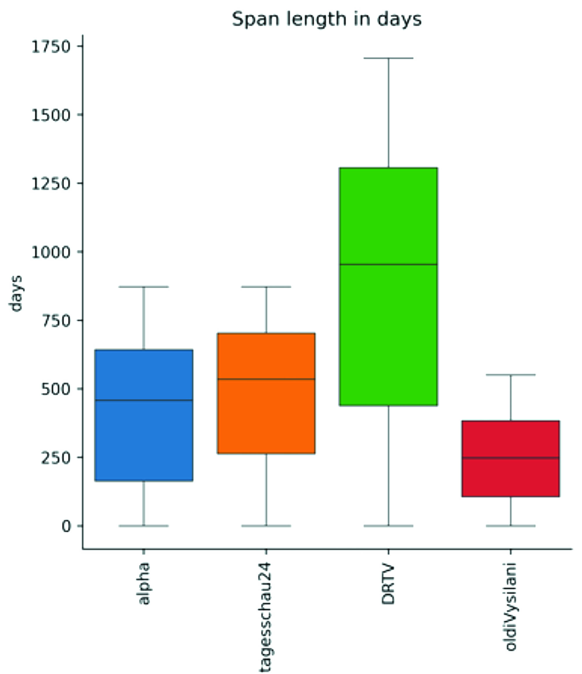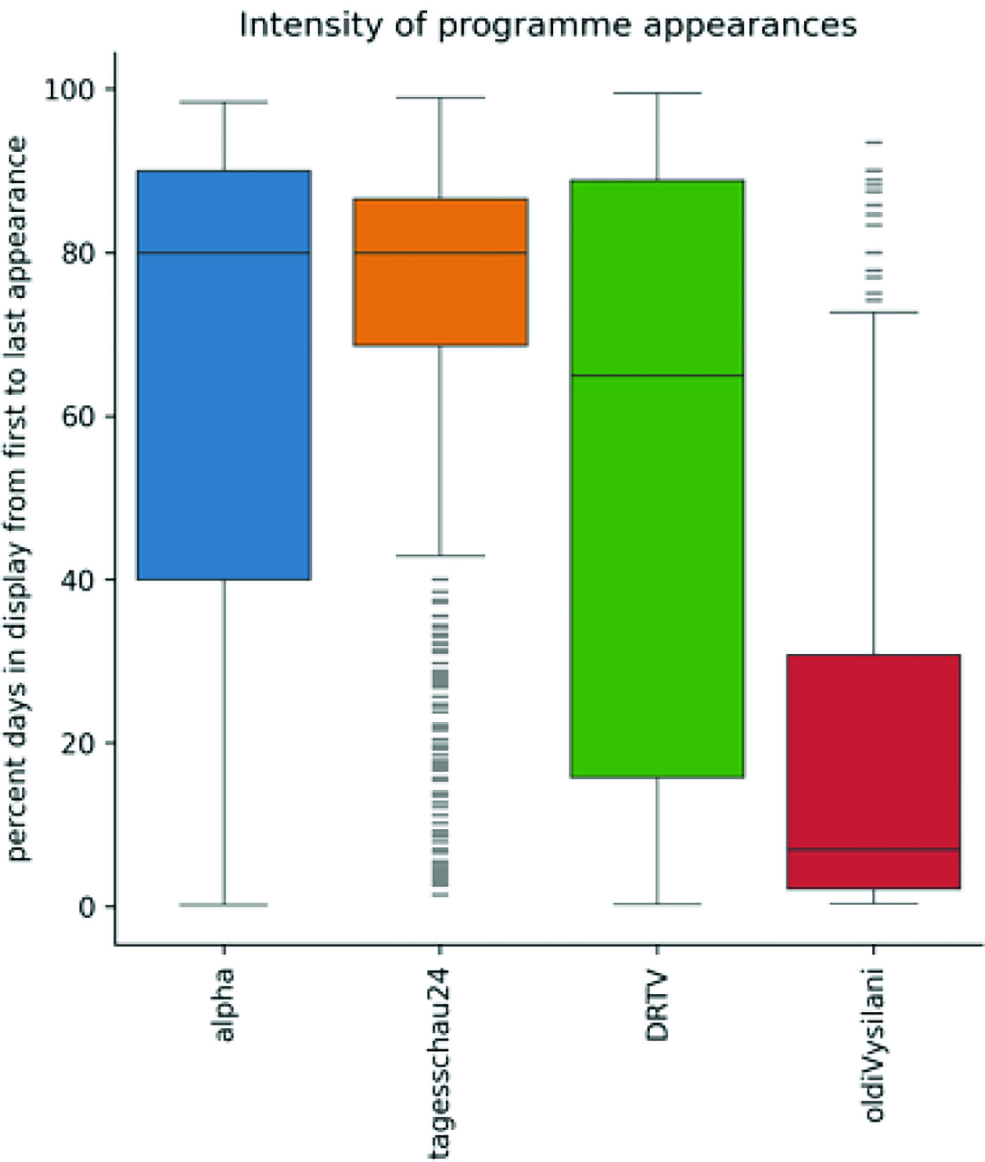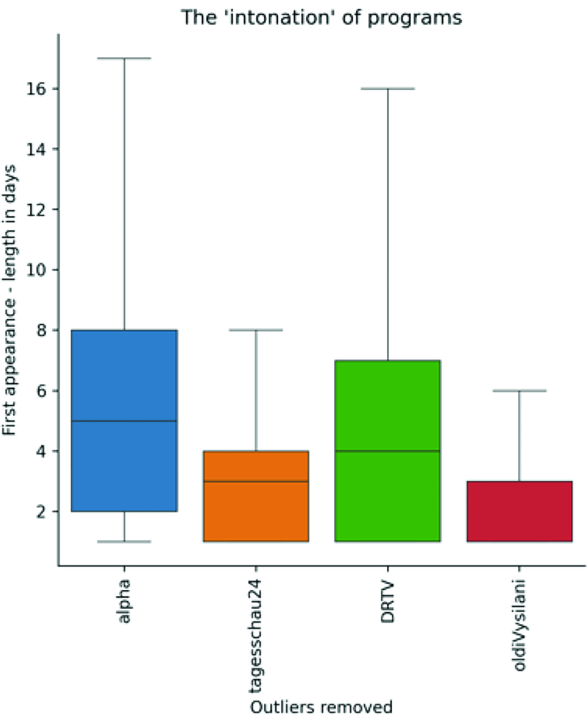Finally, in Figure 15, we plot the length in days of a program’s first appearance, what we term “the intonation.” We assume here that a longer first appearance attracts more user attention to the program title. As the figure makes apparent, the German VoD Alpha has the longest exposure, followed by DRTV, whereas iVysilani (the old version) only shows a title for a short time. The intonation, the time span, the number of reappearances, and the intensity of the reappearances help characterize a user’s possible experience of the VoD front page over time.