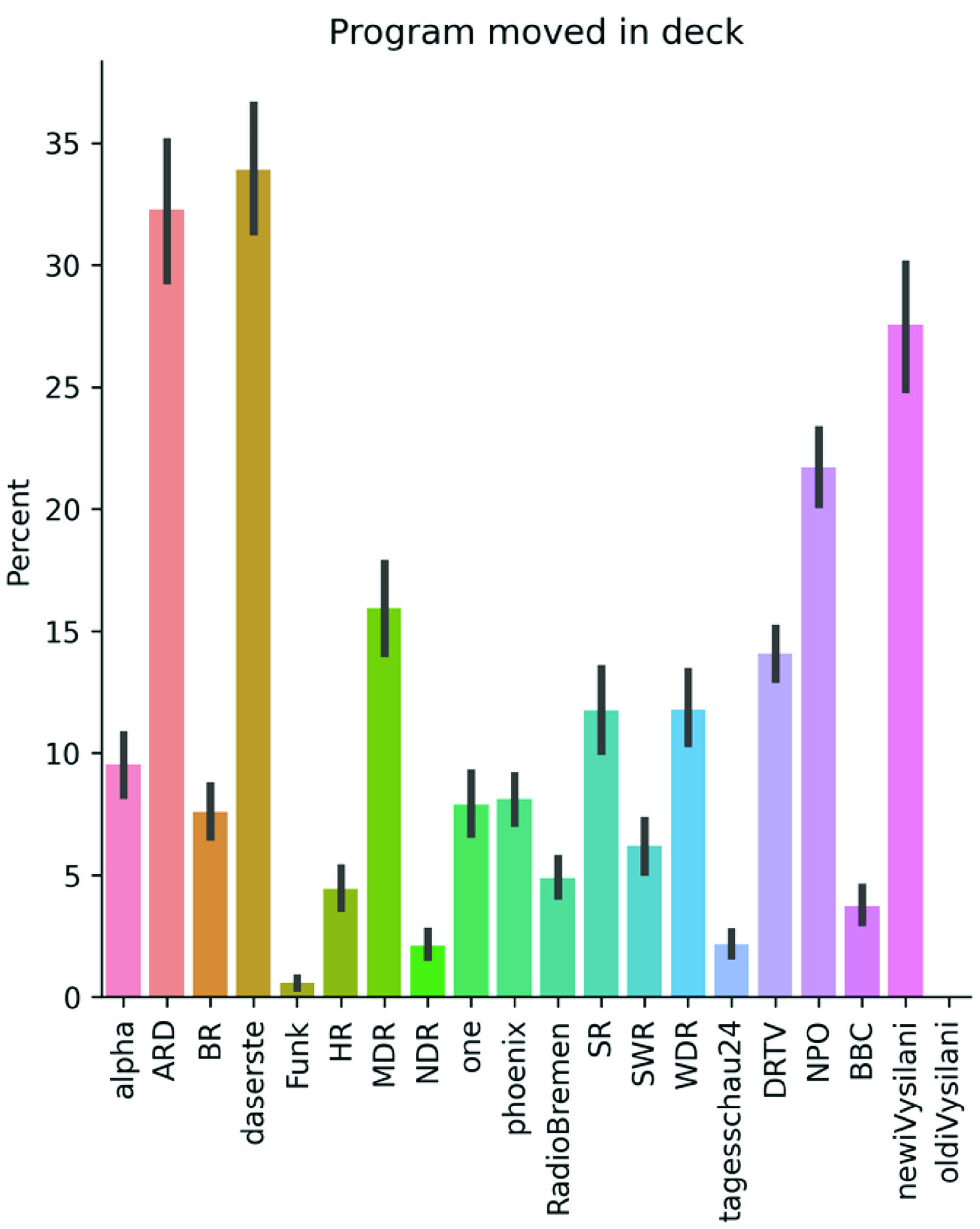When program titles are moved around on the VoD front page, for example, by shifting position in a row, or being placed in another row or shown in another deck, users might get an impression of change even though the programs are not new. Figures 17 and 18 show the level of moved programs, providing an indicator for what we will call “artificial newness.” This allows us to see which VoD services may be moving titles around the front page to give the appearance of new content arriving onto the services.
