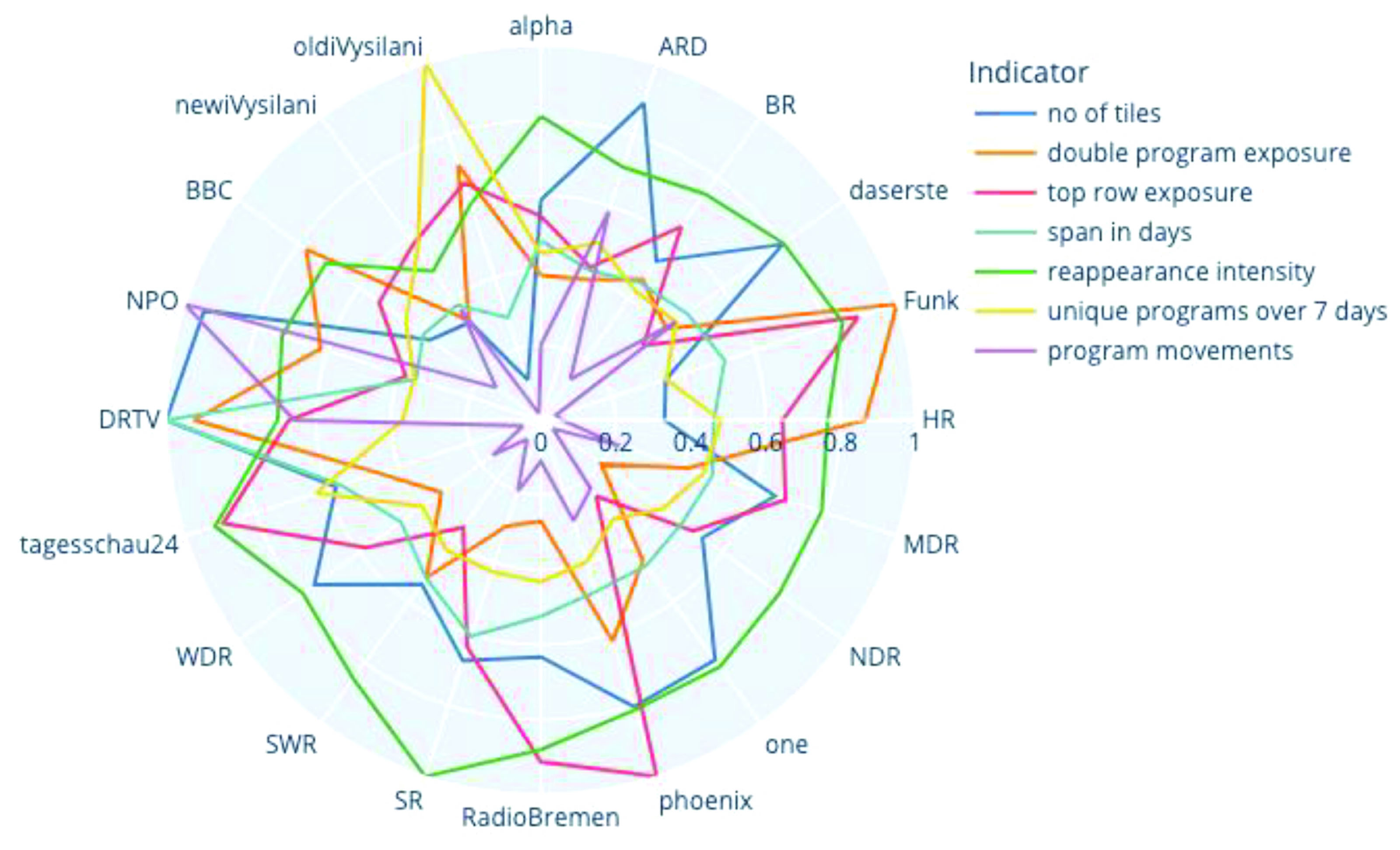 - The “spider plot” helps visually assess the correlation of the indicators: If two lines–two indicators–would follow each other or even overlap around the circle, they would correlate and thus not report on different aspects of the VoDs. The lines are results of a normalization of the measured values for each VoD; the normalization enables the comparison of values at very different scales. For the normalization, we let “1” represent the highest measured value, and all other values calculated as a ratio of 1 for each indicator. We see that the lines have different shapes, testifying the indicators as being capable of describing different aspects of the VoDs. ⮭