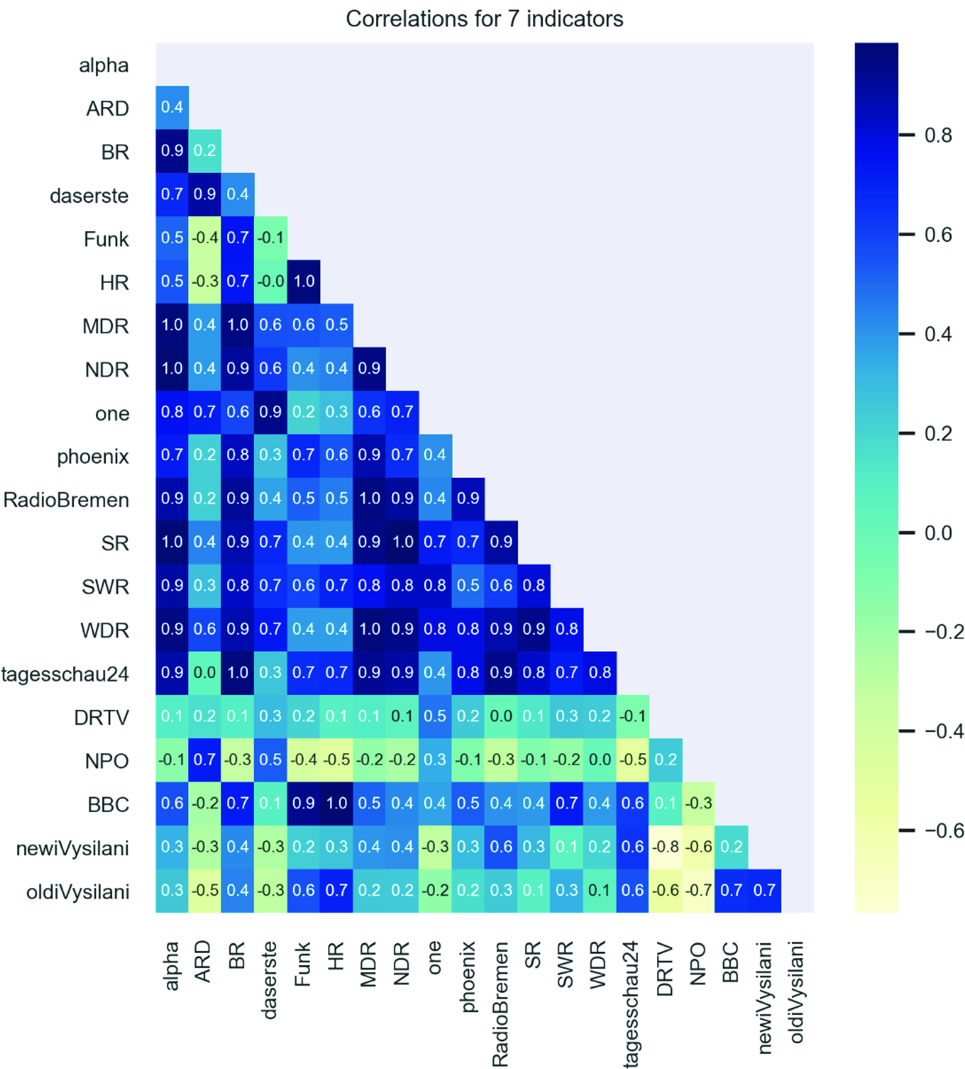 The spider plot draws our attention to the differences between the VoD services when measured using the seven indicators, but the visual complexity makes it difficult to identify similarities among the VoD services.19 The extent to which the VoD services, analyzed through the lens of the seven indicators, are similar or different can be effectively visualized using a heatmap (see Figure 20). In the heatmap, we find that the highest similarity among VoD services with values near 1 is represented in dark blue. The yellow and light green intersections with minus values represent VoD services that are each other’s opposites in the lens of the seven indicators. We observe that many VoD services in the ARD Mediathek have a high mutual similarity, but when compared to the non-German VoD services they are (with exceptions) quite different. When we compare the non-German VoD services with each other, we find several oppositions. NPO, DRTV, and BBC iPlayer have neither a strong positive or negative correlation; this calls for the application of other indicators to describe differences in greater detail. Also surprising is the positive correlation among BBC iPlayer, “old” iVysilani, and “new” iVysilani, even though their interfaces are very different.