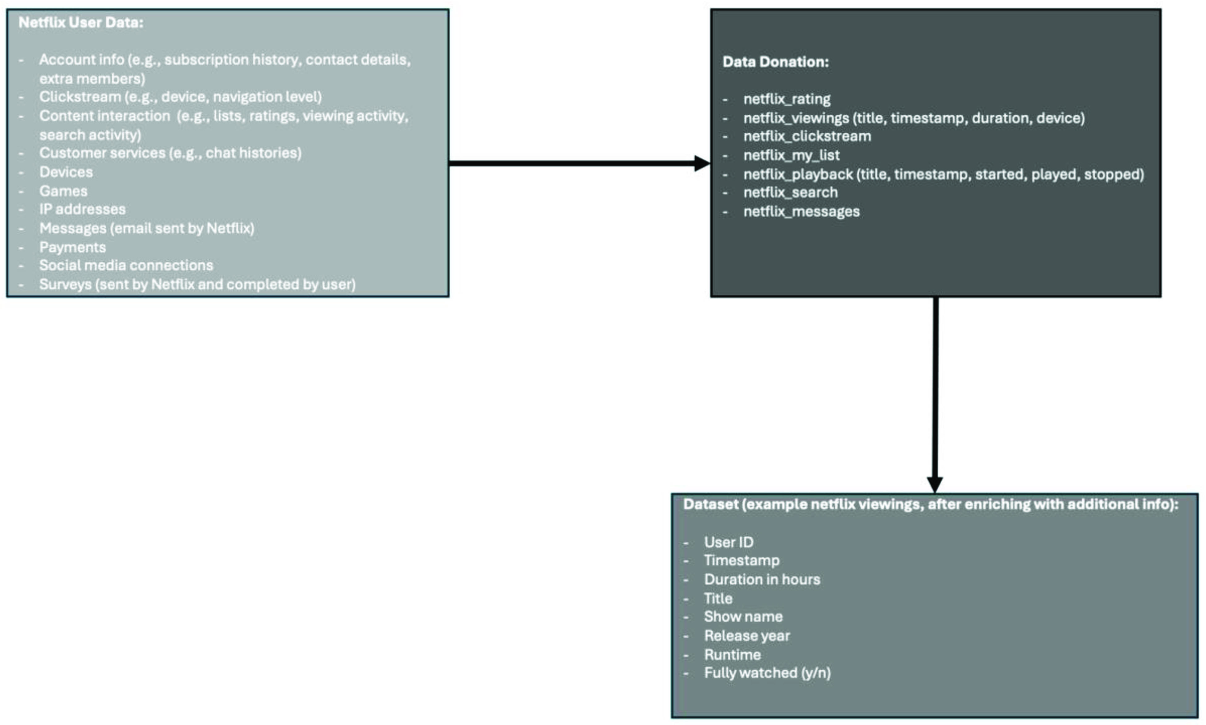In academia, most research on television in the digital age has focused on industries, technologies, or content rather than on audiences, prompting calls for a revival of audience studies.3 In VoD research specifically, the focus has primarily been on analyzing content catalogs4 and platform interfaces.5 Although several studies examine VoD audiences in terms of media choice, interface navigation, and algorithmic engagement, researching media consumption remains challenging due to restricted data access. To overcome this limitation, researchers have employed various methods, including self-reported data from interviews and surveys, observational studies, and analysis of selectively released data from Netflix. The use of actual interaction data in VoD research remains uncommon. While some studies have employed browser extensions to collect such data, these efforts typically involve only a small number of participants over short time periods. A promising solution to data access challenges lies in the ability of European citizens to retrieve their personal data. Under the General Data Protection Regulation (GDPR), individuals have the right to request their personal data from data processors, including global VoD services. Building on this, data donation projects invite individuals to voluntarily share their data for research purposes, offering new opportunities to VoD audience research into media consumption.