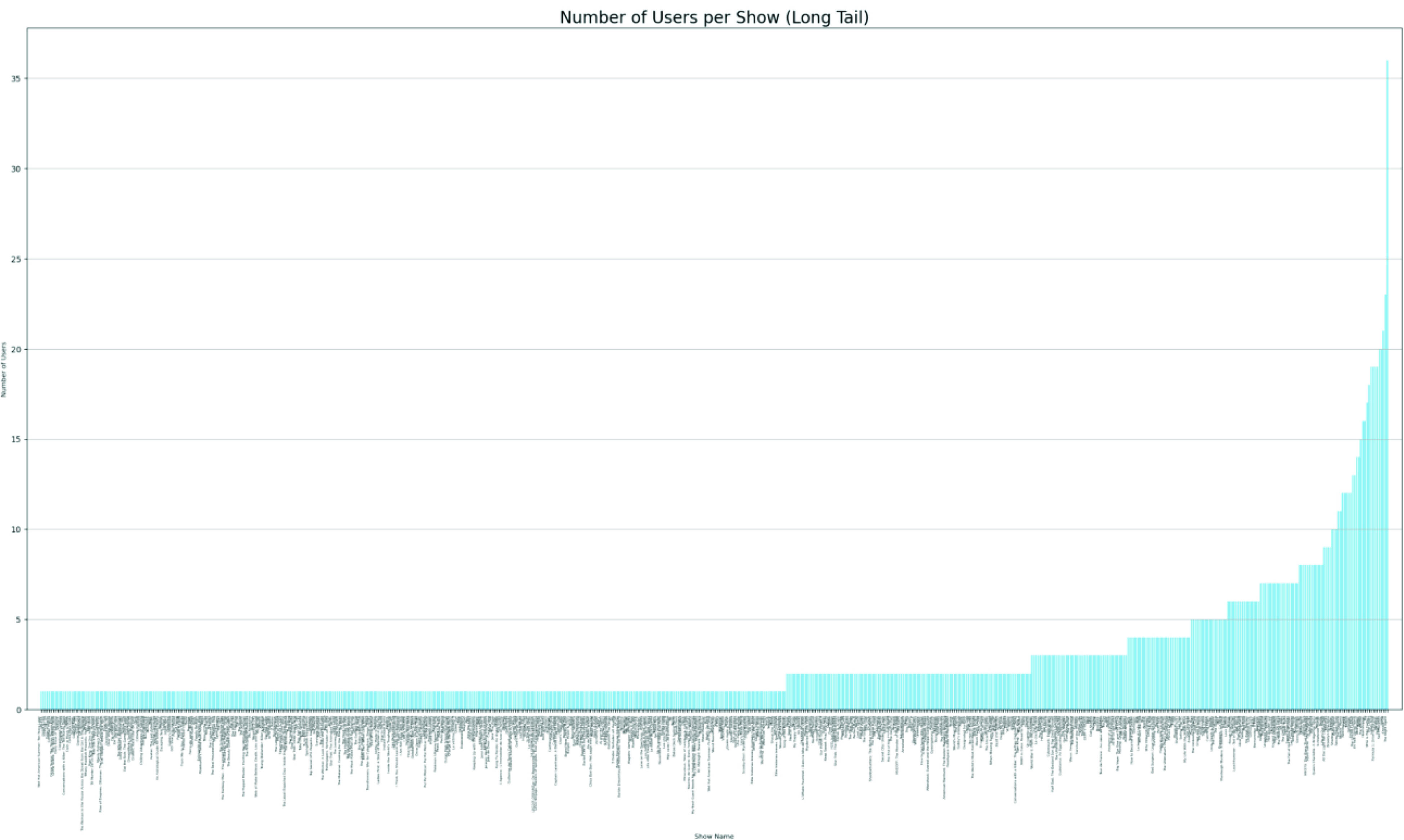To determine what TV shows were popular among Netflix viewers in the Netherlands in 2023, we first identified the number of unique titles and calculated how many unique users watched these. In this way, it becomes possible to detect TV shows that seem to be watched by a relatively large share of unique users and what titles receive less attention. In total, users engaged with 1,196 different TV shows. This also includes interactions where users watched only a fraction of an episode. When considering only interactions where viewers completed at least one episode, this number drops to 779 unique titles, accounting for 65.2 percent of all TV shows. This number suggests that in circa 35 percent of cases, users started episodes but did not complete them, likely reflecting browsing behavior. When focusing on TV shows where users watched complete episodes, the analysis reveals a typical long-tail distribution (Figure 2).