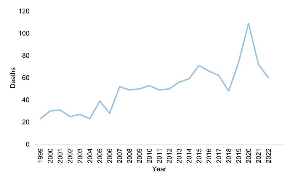 We examined the Centers for Disease Control WONDER multiple cause of death database for the years 1999-2022, examining ICD code T51.1, corresponding to deaths involving Methanol poisoning.5 Trends were characterized using Joinpoint Regression Program Version 5.0.2 (National Cancer Institute). The Johns Hopkins Medicine Institutional Review Board determined that this study did not constitute human subjects research.