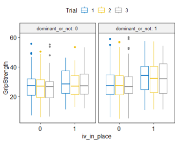 Our analysis included 104 patients, with a mean HGS of 30.2 kg (SD: 11.11 kg) and 27.7 kg (SD: 9.5 kg) for dominant and non-dominant hands, respectively. The difference in HGS between dominant and non-dominant hands was 3.9 kg with IV (95% CI: 2.0-5.7) and 1.9 kg without IV (1.2-2.7). Repeated measures within each hand were not significantly different (p=0.053 left, p=0.055 right). Significant differences were found between handedness for all trials (p=3.53e-10), between trials (p=0.031), and the interaction between IV placement and handedness (p=0.024). No significant differences were found for either dominant (p=0.88) or non-dominant hands (p=0.60) when evaluating HGS between trials and with or without IV placement within each.