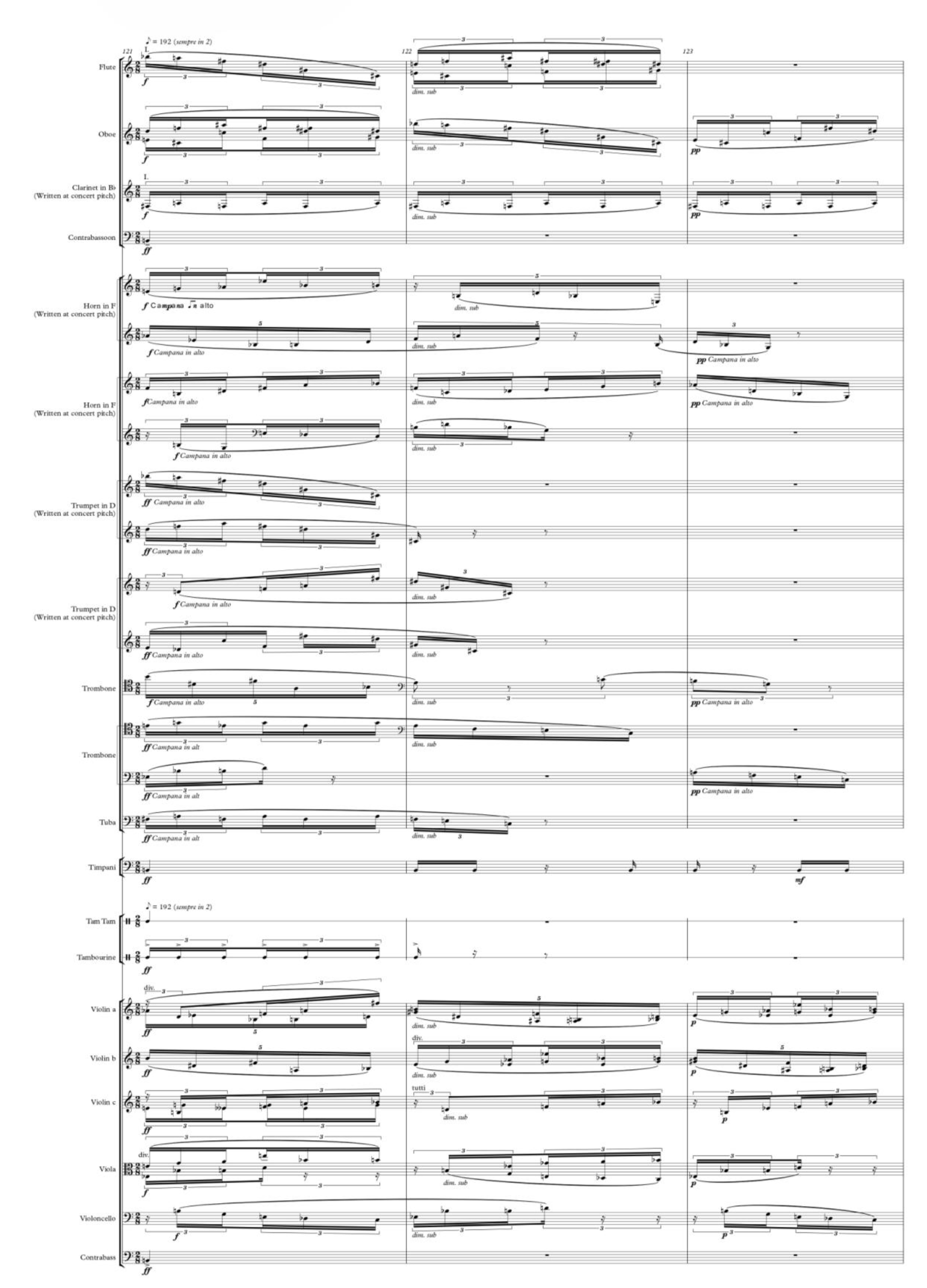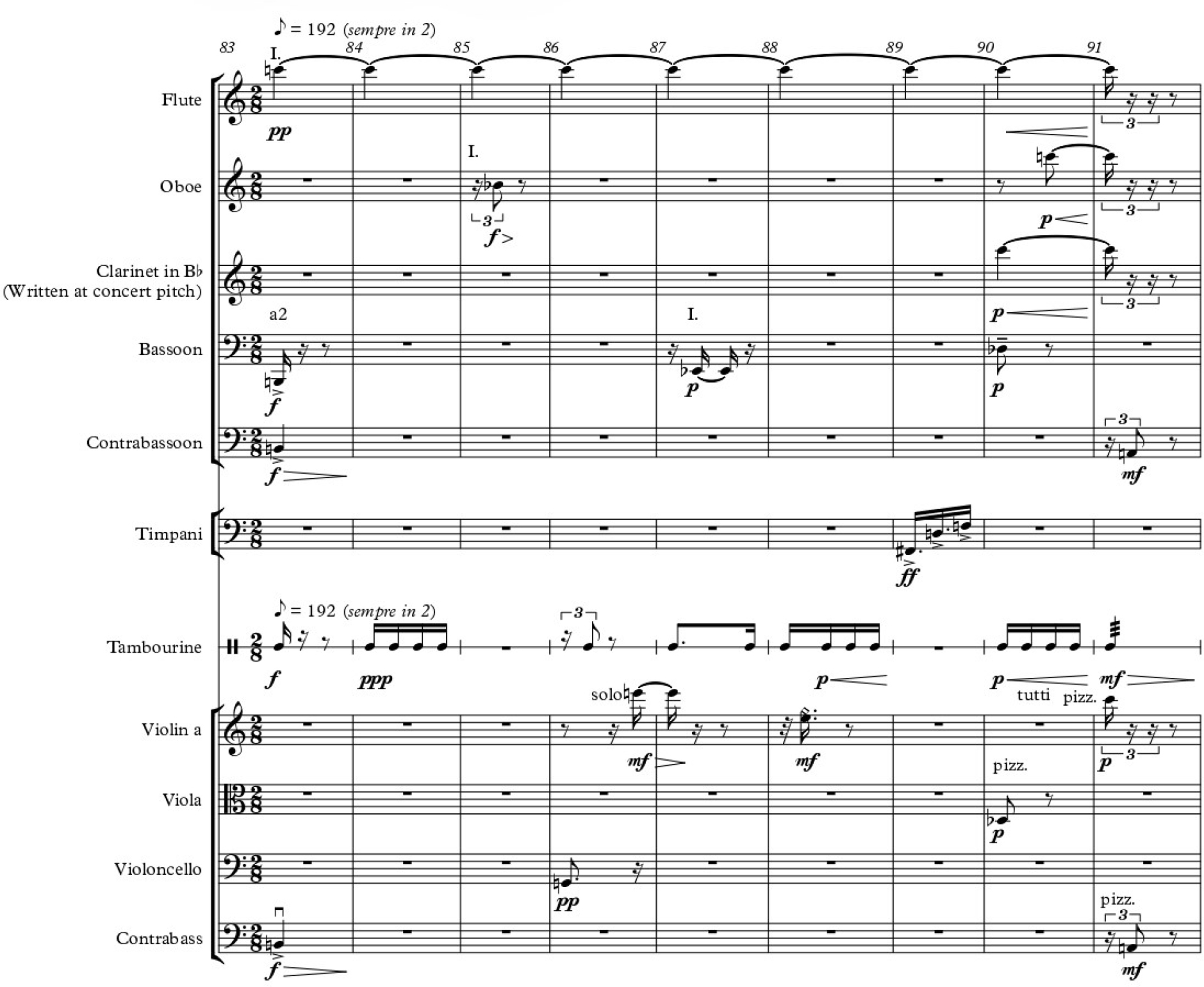This climatic “condensation” assumes tremendous importance within the piece, filtering the listener’s experience of the surrounding music in more detail (music example 1.2, 1.3 and 1.4). The third section begins (at bar 83) in a quiet and pointillistic fashion, with sustained flute sounding against scattered points in the rest of the ensemble. There is a small textural and dynamic crescendo (bar 90), which quickly dissipates (bars 91–92). This is followed by the entrance of a repeated note figure in the viola, against which the rest of the ensemble resumes its previous pointillistic mode. The pointillistic quality continues as the repeated note figure is passed around the ensemble until it is mobilized as part of a more extended textural and dynamic crescendo (bars 106–110). The figure is repeated once more in the upper winds (bars 111–112), but now the music has shifted. Continuous rapid accented fortissimo notes begin to take hold as angular melodic fragments—without recognizable motivic-thematic qualities—are presented in rapidly changing instrumental timbres. At the same time, the texture thickens, with multiple instruments sounding to produce polyrhythmic conflicts. These polyrhythmic conflicts persist as the climatic “condensation” comes to the fore. The music realizes a considerable increase in musical excitement as the dynamics become louder and the texture thicker until the point of saturation identified by Hicks arrives (bar 121), followed by a dynamic and textural diminuendo from bar 122 onwards.