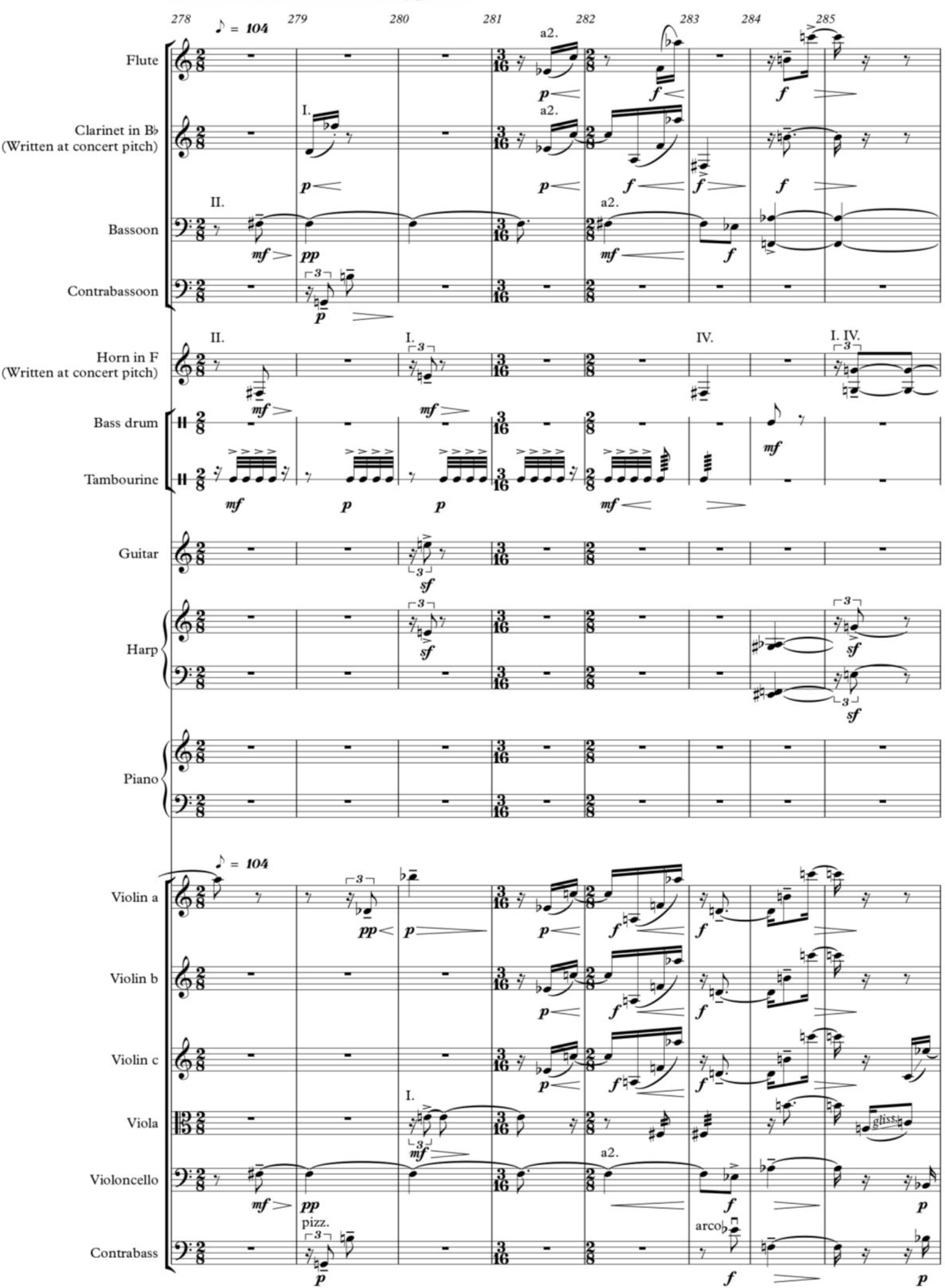 Through attending to how this section utilizes secondary parameters, its musical logic is relatively clear. There is little difficulty in linking this work with the serialism practiced by the Darmstadt School (as it has been theorized here). But before making this leap, there is something that must be addressed. Namely, in bars 93–110, the relatively stable identity of the repeated figure and its stubborn repetition—basically functioning as an accompanimental figure—gives the section a motivic and metric consistency, perhaps even a subdued sense of conventional rhetoric. This is not an isolated case: another example can be seen between bars 278–285. Here a fragmentary and pointillistic “accompaniment” (similarly held together by a repeating rhythmic figure, here in the tambourine) is set against rising string melodies (music example 1.5). One could also note the loud “tutti” that closes the work in a cadence-like manner. These moments are grist for the mill for Berio’s commentators who have narrated his cultural production in terms of his persistent individuality.