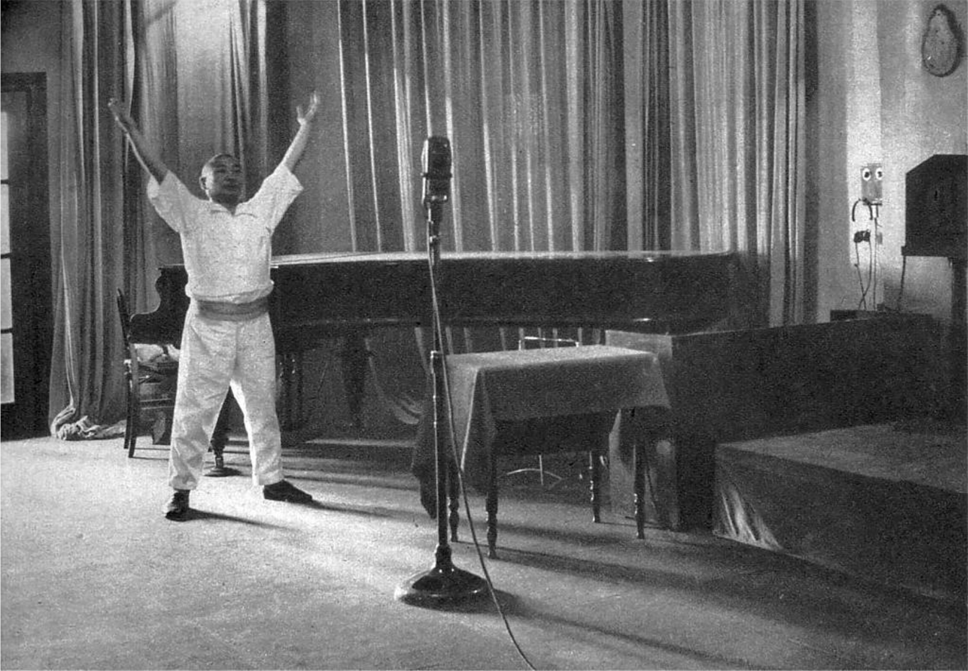 NHK Rajio Taisō announcer Riichi Egi posing in the Tokyo studio in 1938 (Shōwa 13). Shukan Asahi (週刊朝日).10