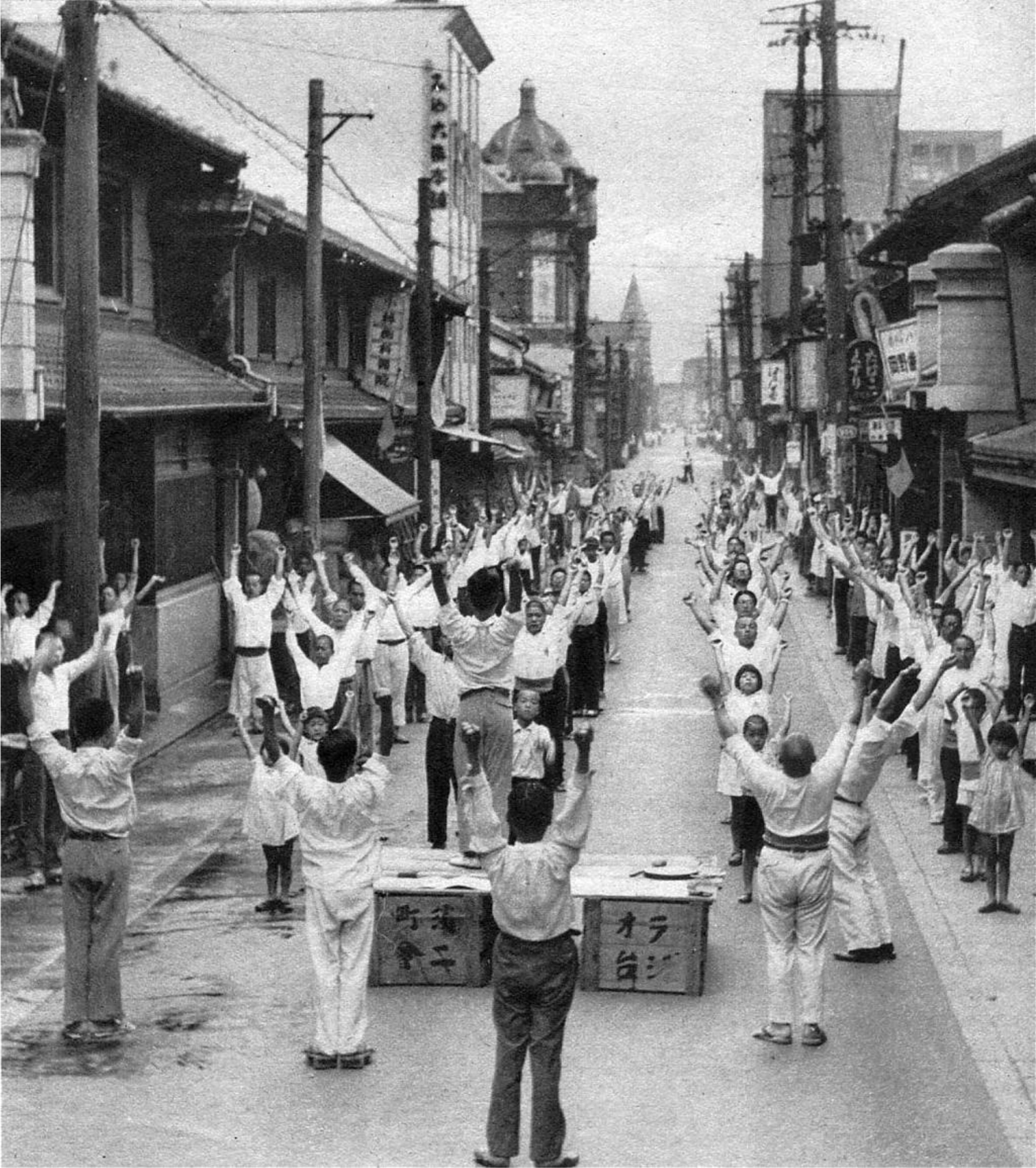 - Source: Kjeld Duits. “1930s: How Radio Gymnastics Conquered Japan,” Old Photos of Japan. October 28, 2024, accessed March 19, 2025, https://www.oldphotosjapan.com/photos/891/radio-gymnastics-calisthenics-rajio-taiso-vintage-photography. ⮭