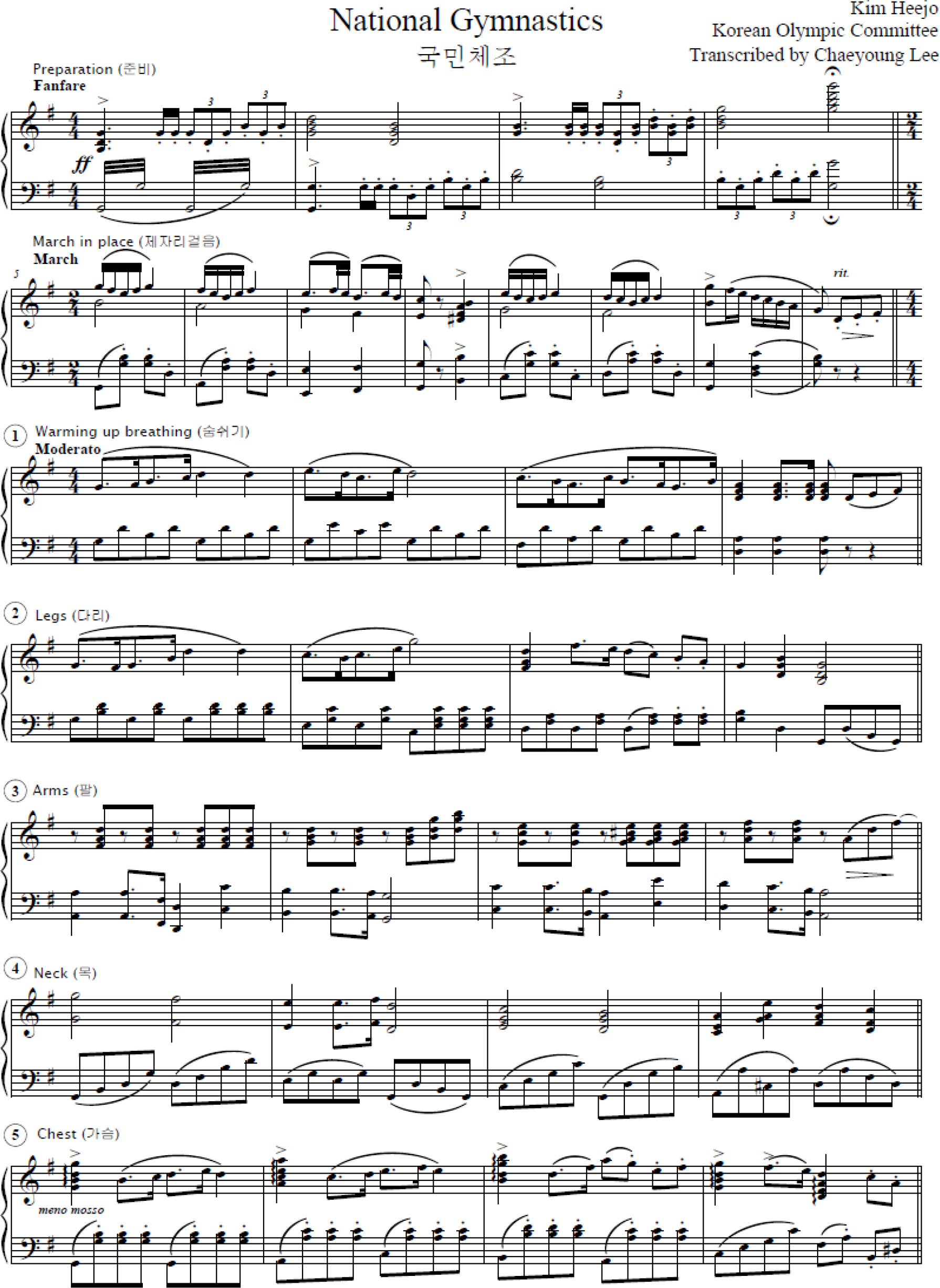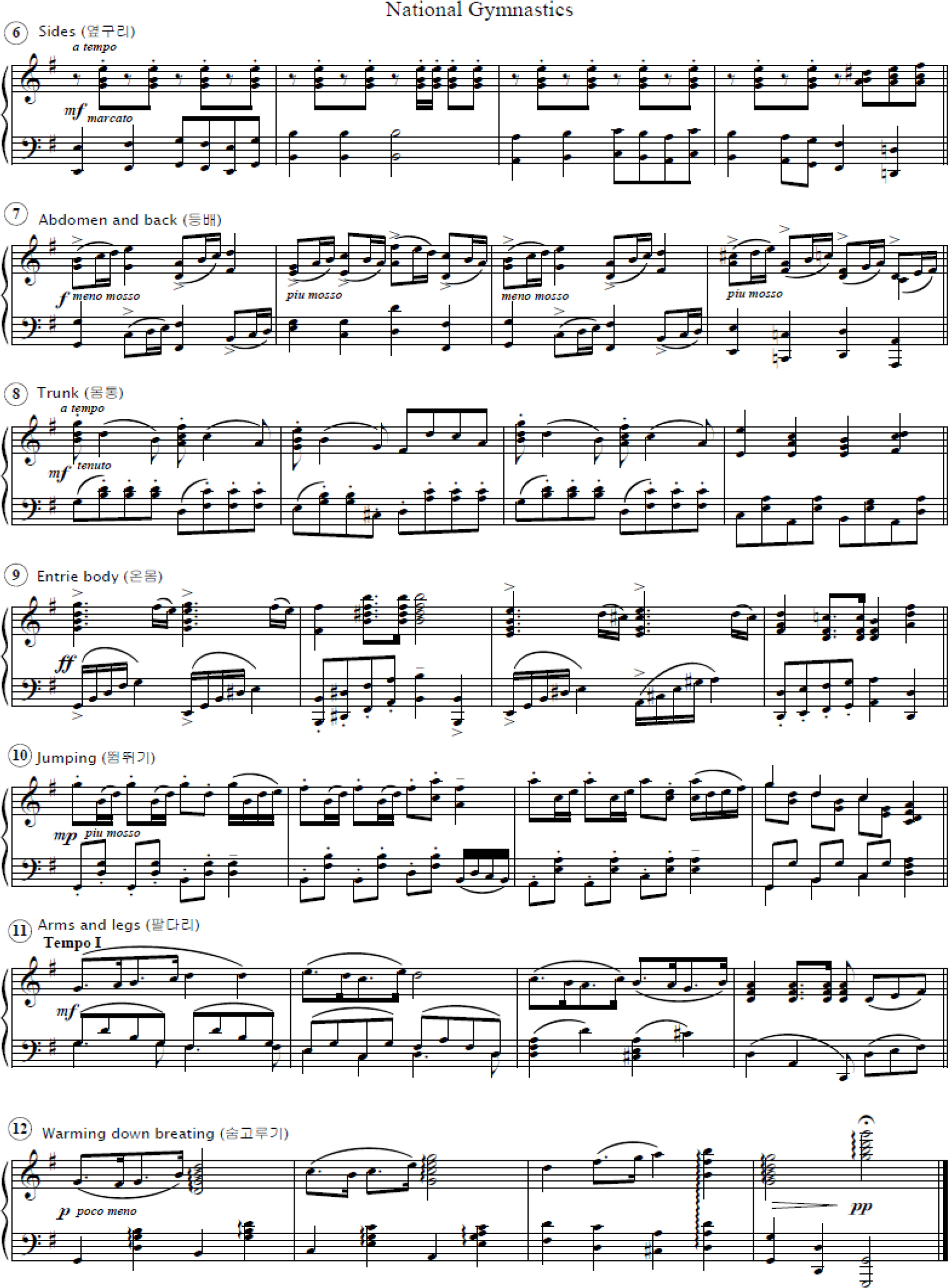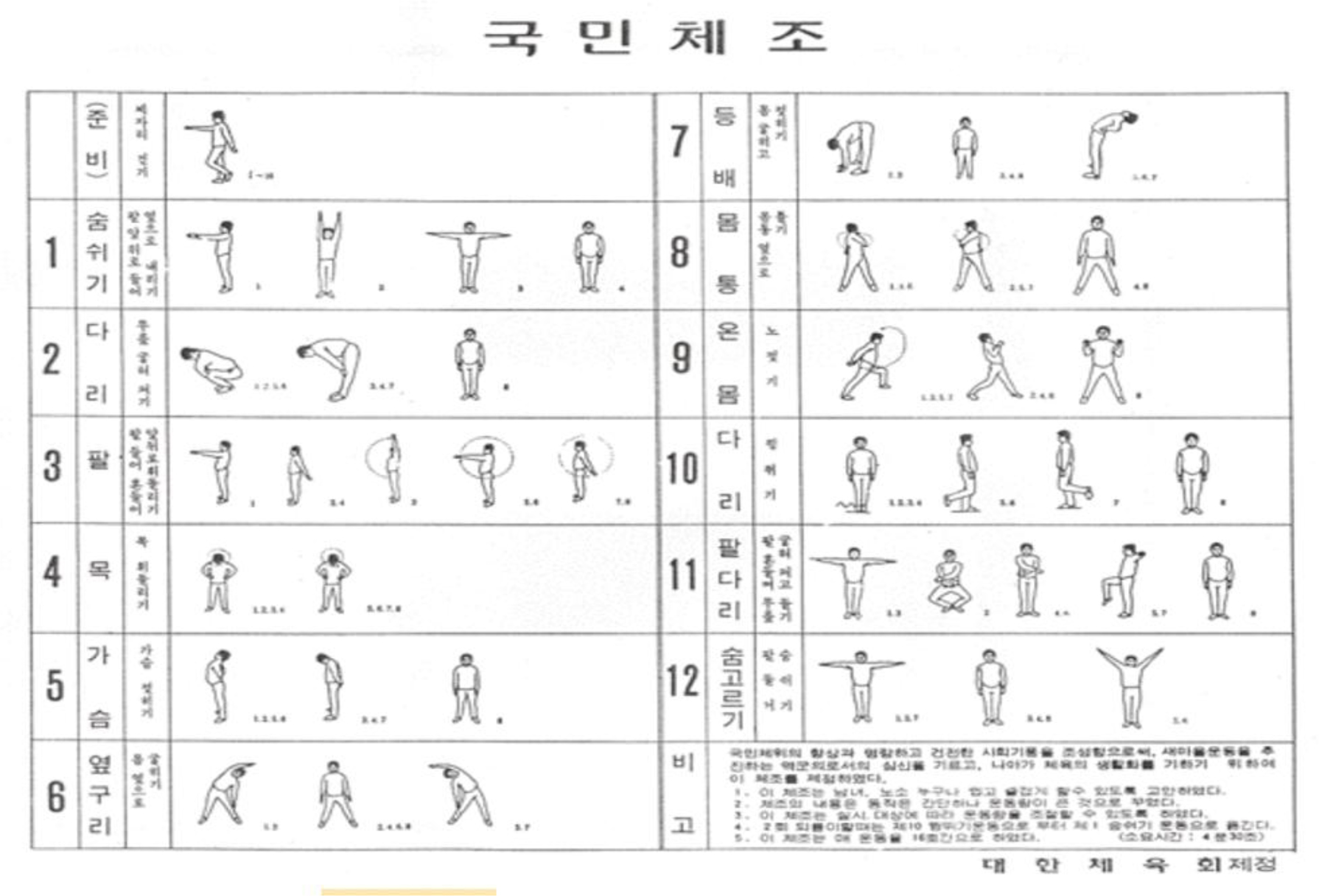 Like Japanese Radio Exercise, National Gymnastics is a sequence of free-hand calisthenics activities composed of gymnastics, music, and verbal instructions. The music was composed by Kim Hee-jo (1920–2001), a former bandmaster of the South Korean Army, who served until his retirement as a lieutenant colonel in 1957. He composed numerous military marches and songs and later remained active in musical theater, broadcast music, and university teaching. The gymnastics routine and verbal instructions were created by Yoo Geun Lim (1932–), who was the vice president of the Korea Gymnastics Association and professor at Kyung-hee University. The gymnastics program consists of twelve different movement groups, each focusing on different body parts: warm-up breathing exercise, legs exercise, arms exercise, neck exercise, chest exercise, sides exercise, abdomen and back exercise, trunk exercise, entire body exercise, jumping exercise, arms and legs exercise, and warming down breathing exercise (see Figure 5). Starting with a warm-up, the exercise gains in intensity to involve the entire body in exercise and jumping before relaxing.