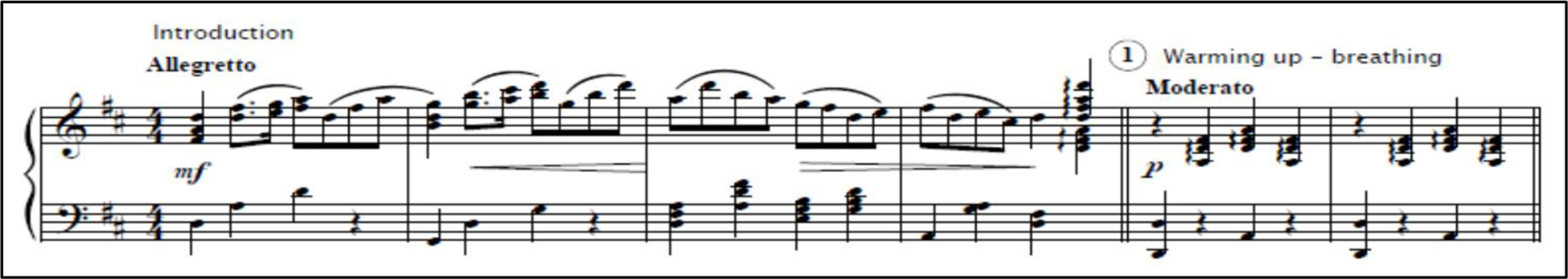 ) and ascending arpeggio are characteristically used in the music (see Music Example 1). The dotted rhythm is suggested in the motif in the introduction and appears numerous times throughout the music. The rhythm drives the music, adding consistency, continuity, and liveliness. The arpeggio is used to mark pauses and endings; it is used for the end of the introduction and for the “warm-up breathing” section.