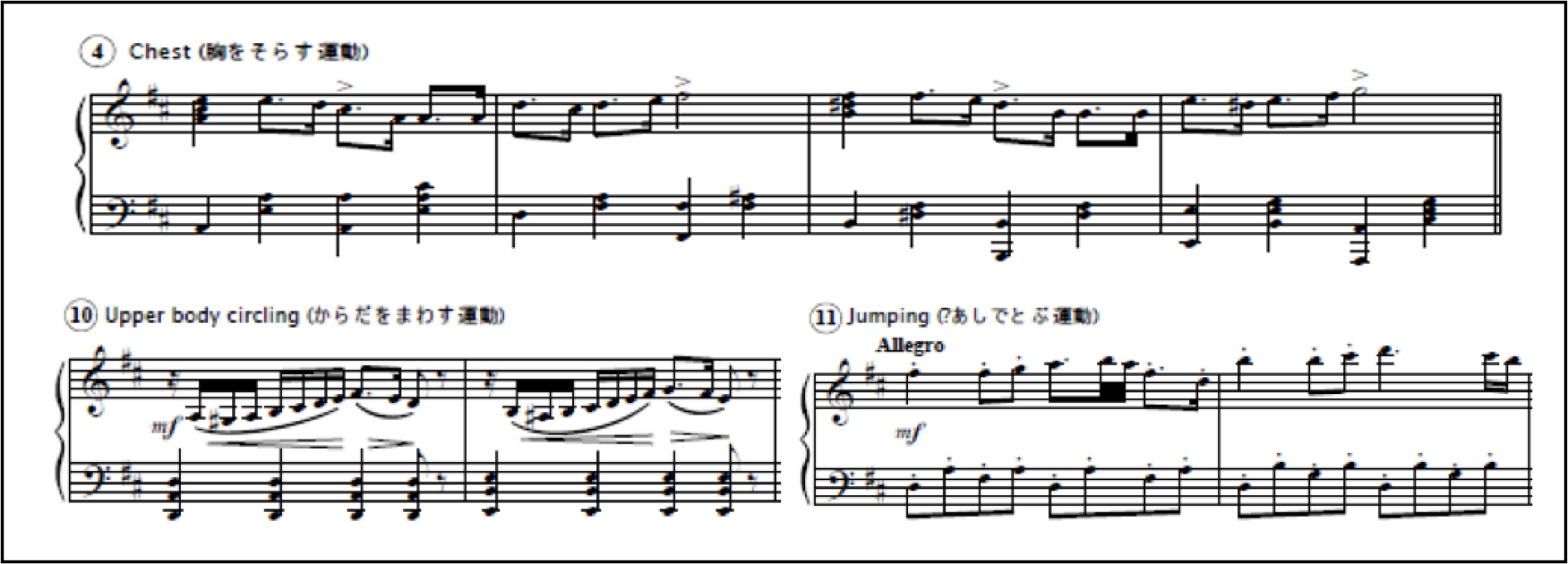 The music for the third Radio Exercise is a piano piece in D major in common time, consisting of fifty-four measures in total. The first four measures constitute the introduction, serving as a prelude. Because the third Radio Exercise was initially designed to be done without the use of verbal instructions, the prelude of the third Radio Exercise serves the role of Egi’s verbal introduction in the first Radio Exercise, which announces the start of the Radio Exercise program. All the body movements are done for the duration of four measures, except the first movement, a breathing exercise. The breathing exercise is done for two measures, providing the performer with a warm-up before the actual exercise begins.