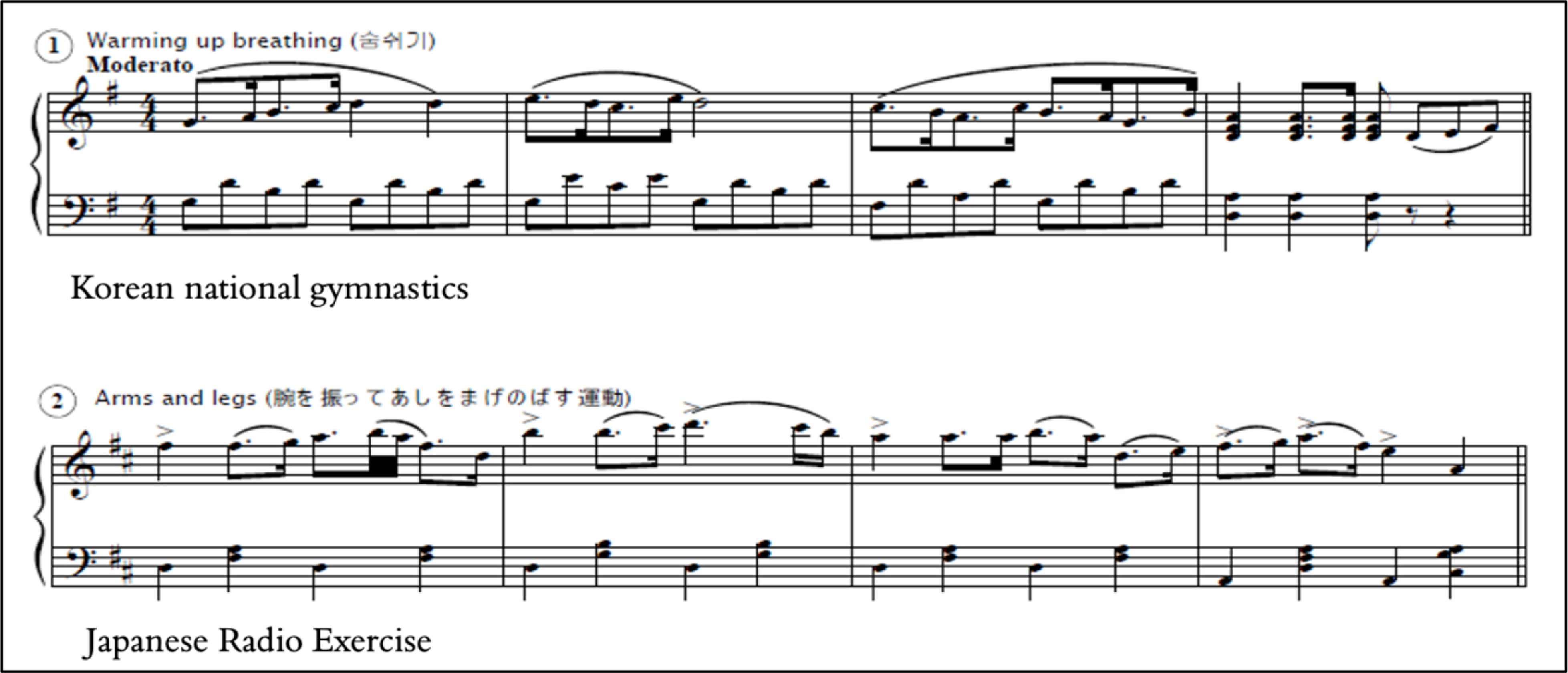 While National Gymnastics looks and sounds more militaristic, its melody and structure are notably similar to those of the music of the third Japanese Radio Exercise. The music of National Gymnastics is composed in G major in four–four time, consisting of sixty measures. As in the third Radio Exercise, a dotted eighth-sixteenth rhythm also dominates and drives the music. The use of an ascending diatonic melodic contour is also similar to Radio Exercise, as we can observe in the motifs of the two programs in Music Example 4.